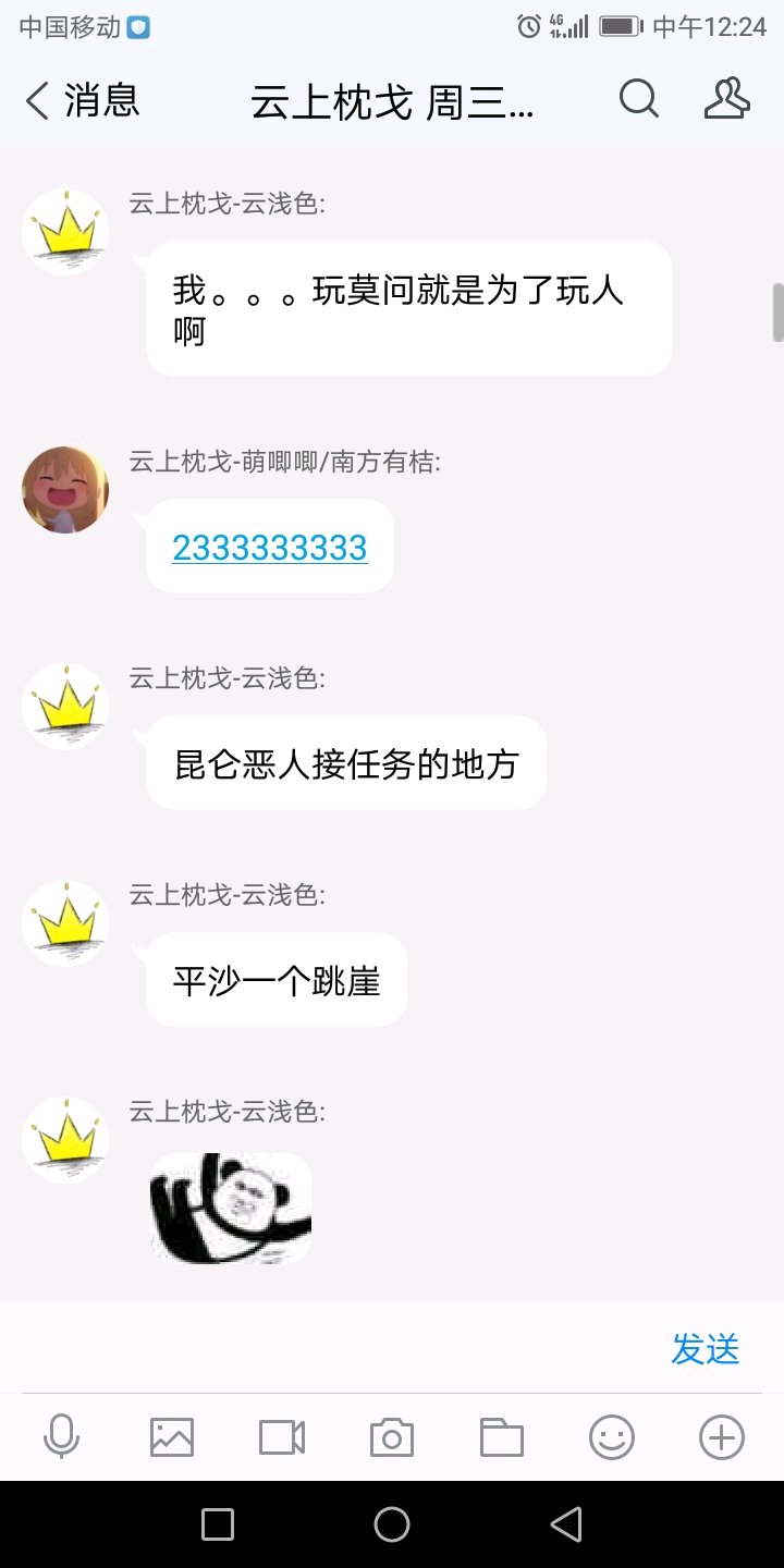 因为那段时间我感觉群里主要活跃的人,都被母神洗脑说了我好多坏话,所以我当时很不理智(我在这里很抱歉),想着报复云上,因为云上帮会群主要的聊天就是那几个人了。