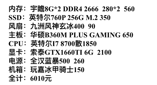 小白求大佬给配个单子,6000左右。显示屏不算在内,不过也请推荐一个。小白一个,不会装系统。打算装好到店里去装系统