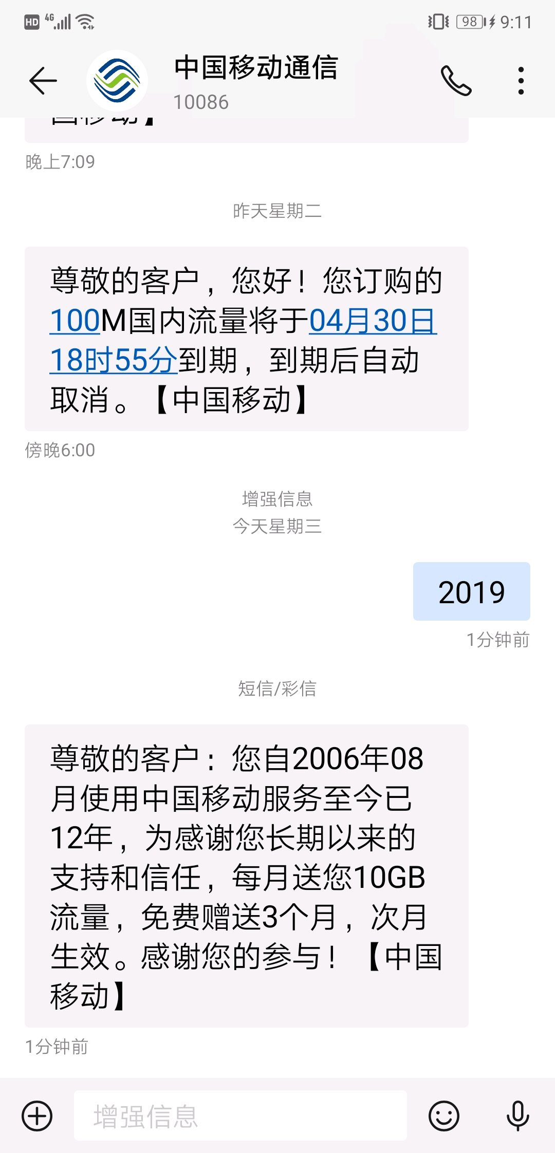 尊敬的客户:您自2005年08月使用中国移动服务至今已13年,为感谢您长期以来的支持和信任,每月送您10GB流量,免费赠送3个月,次月生效。感谢您的参与!【中国移动】