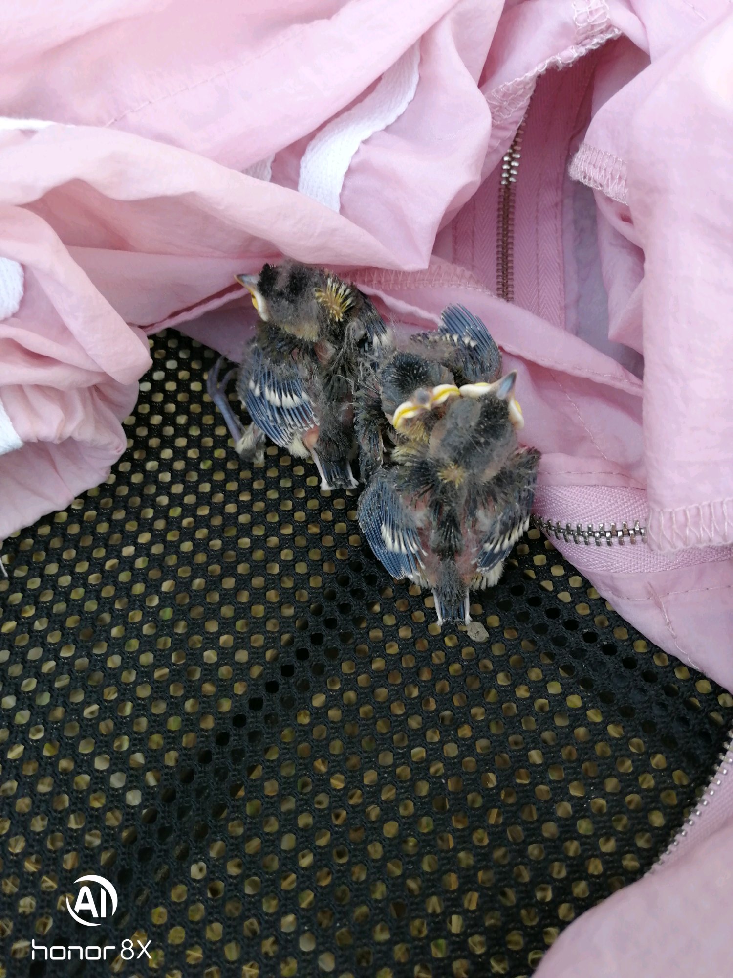 今天野外土山边树下捡到一窝三只雏鸟 不知道是不是大山雀品种