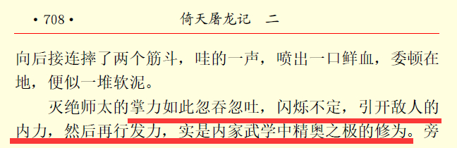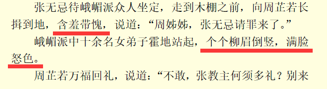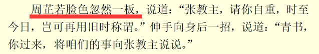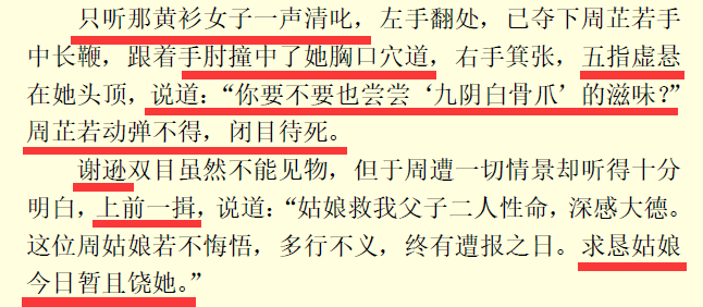 当然仍旧会有读者将周芷若迟迟不插下手爪杀死谢逊解读为,周芷若心存不忍,或者对谢逊,或者对张无忌,仍旧顾念过往恩情。这里仅提出一点反驳,『秘笈兵书此中藏』中,谢逊和成昆恩怨已了,群豪纷纷以羞辱的方式向谢逊报仇时,出现了下面一幕。