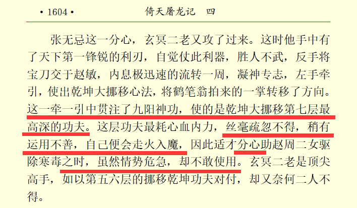 此处张无忌的处境到底有多险恶,除了上述提及与三僧对抗生死一线外,还在于当时粘住对方所使用的武功招式乃是“乾坤大挪移心法中最高深”的层次。在『秘笈兵书此中藏』这一章中,张无忌对战玄冥二老时,就提到了使用乾坤大挪移第七层武功时的凶险。