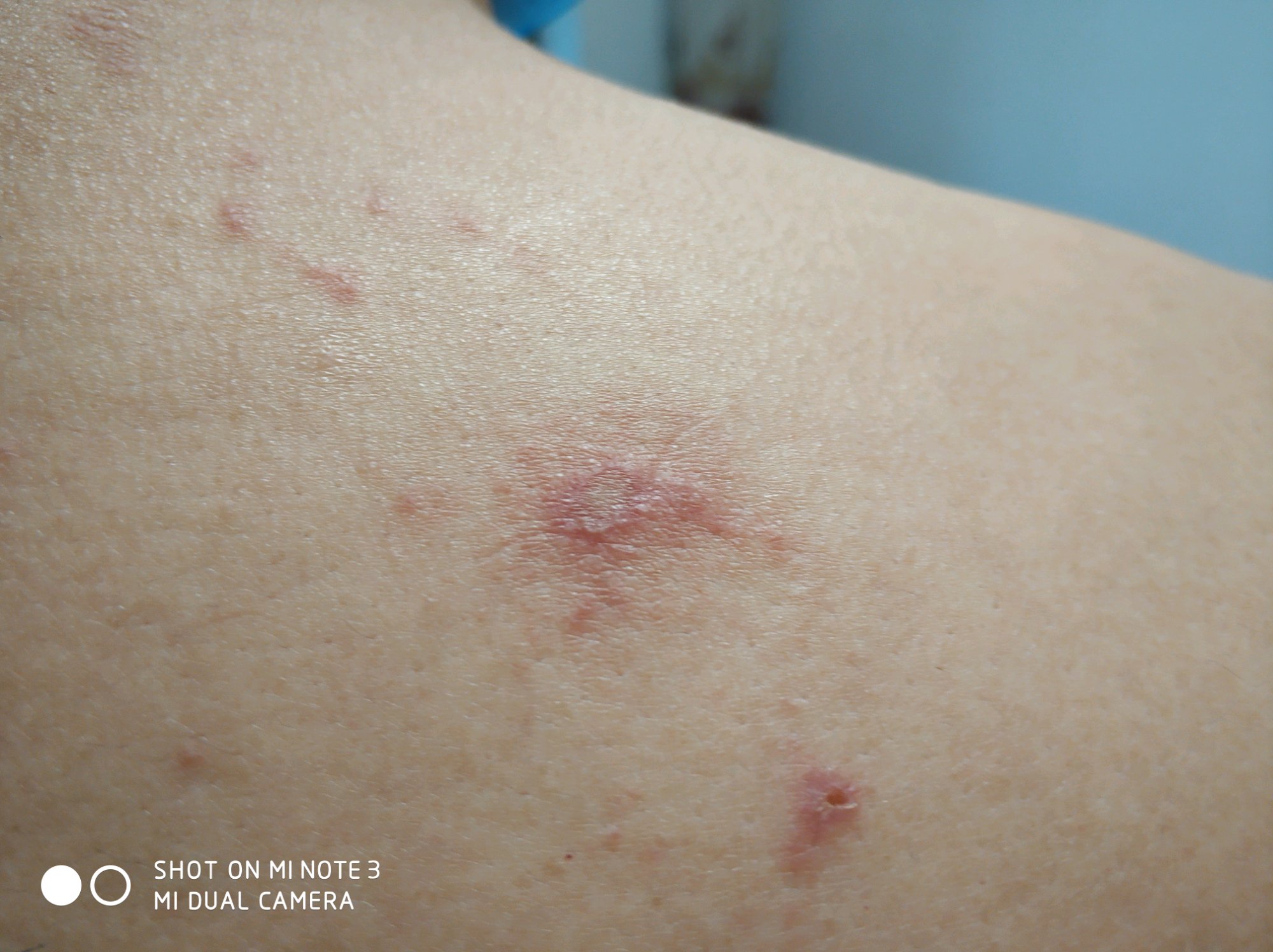 有没有人告诉小弟这是什么情况?昨天晚上才发现,有点像紫外线晒伤的那种疼,当时洗澡今天早晨发现这样。无凸起,但中间看起来发白有浓的样子