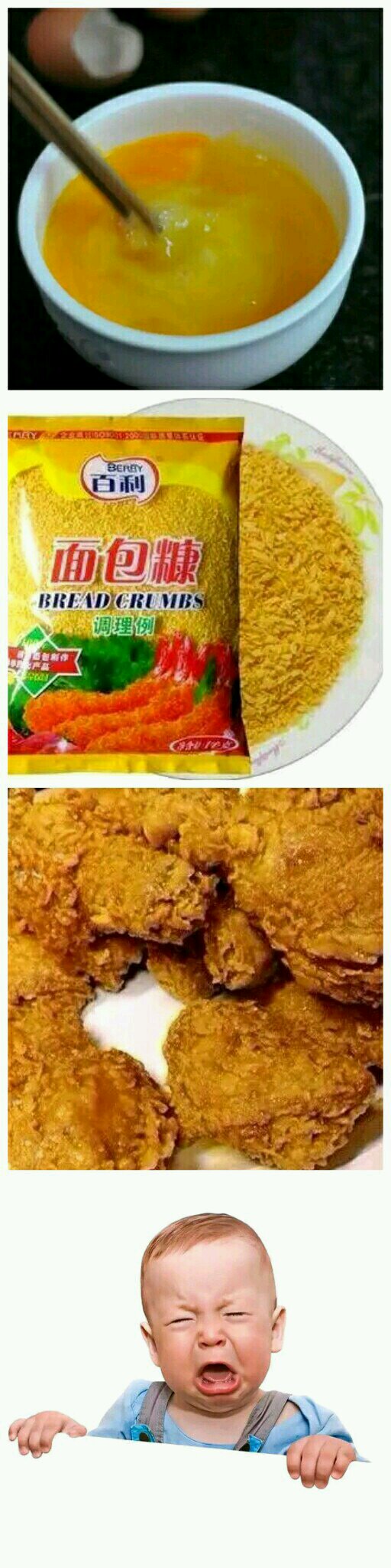 已经裹上面包糠,放进油锅炸到两年焦黄。隔壁小孩也炸了。