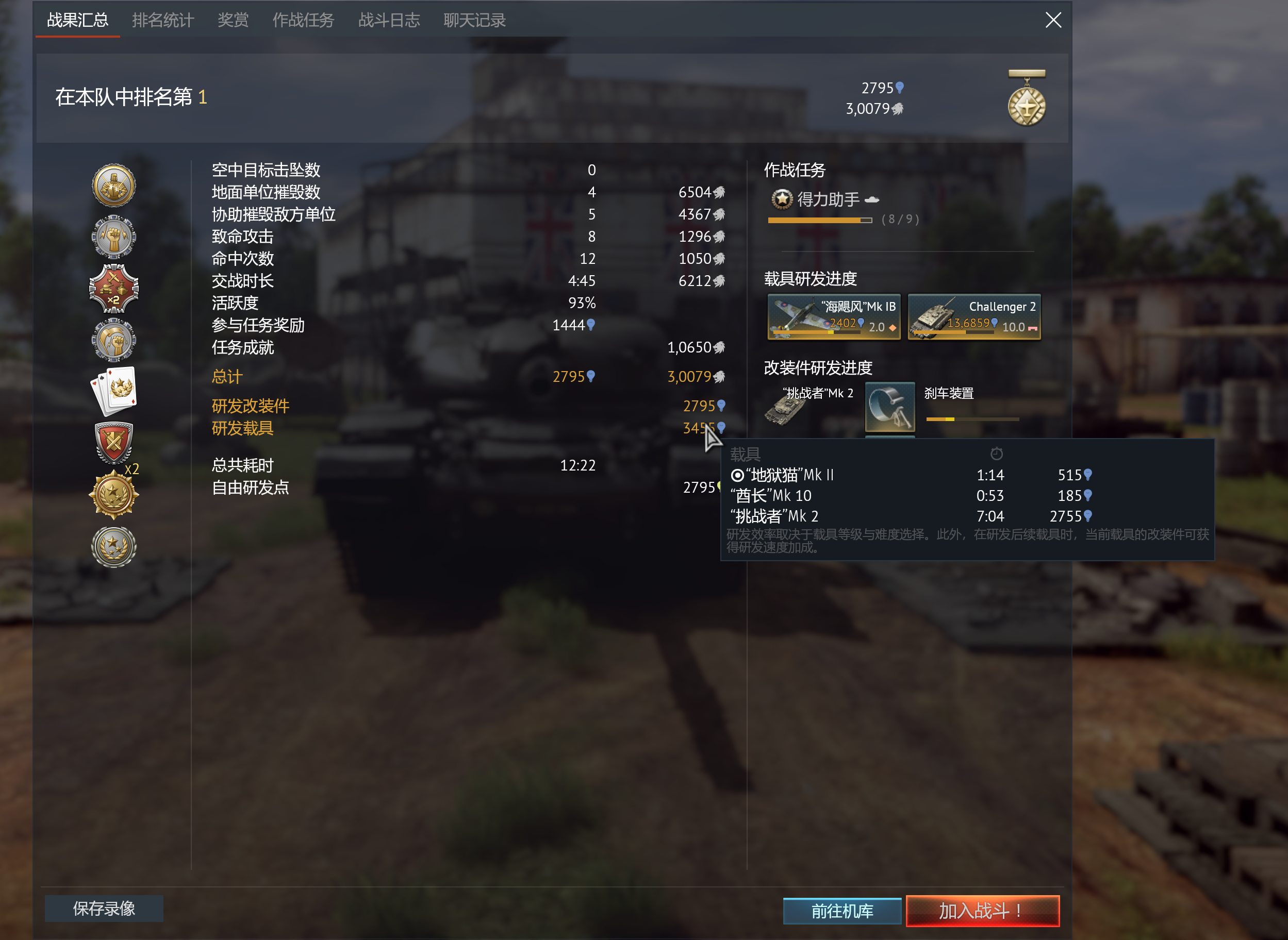带vip,6级车研发7级车,排名第一全程基本用挑战者打的,没用其他载具,打完挑战者才2755经验???