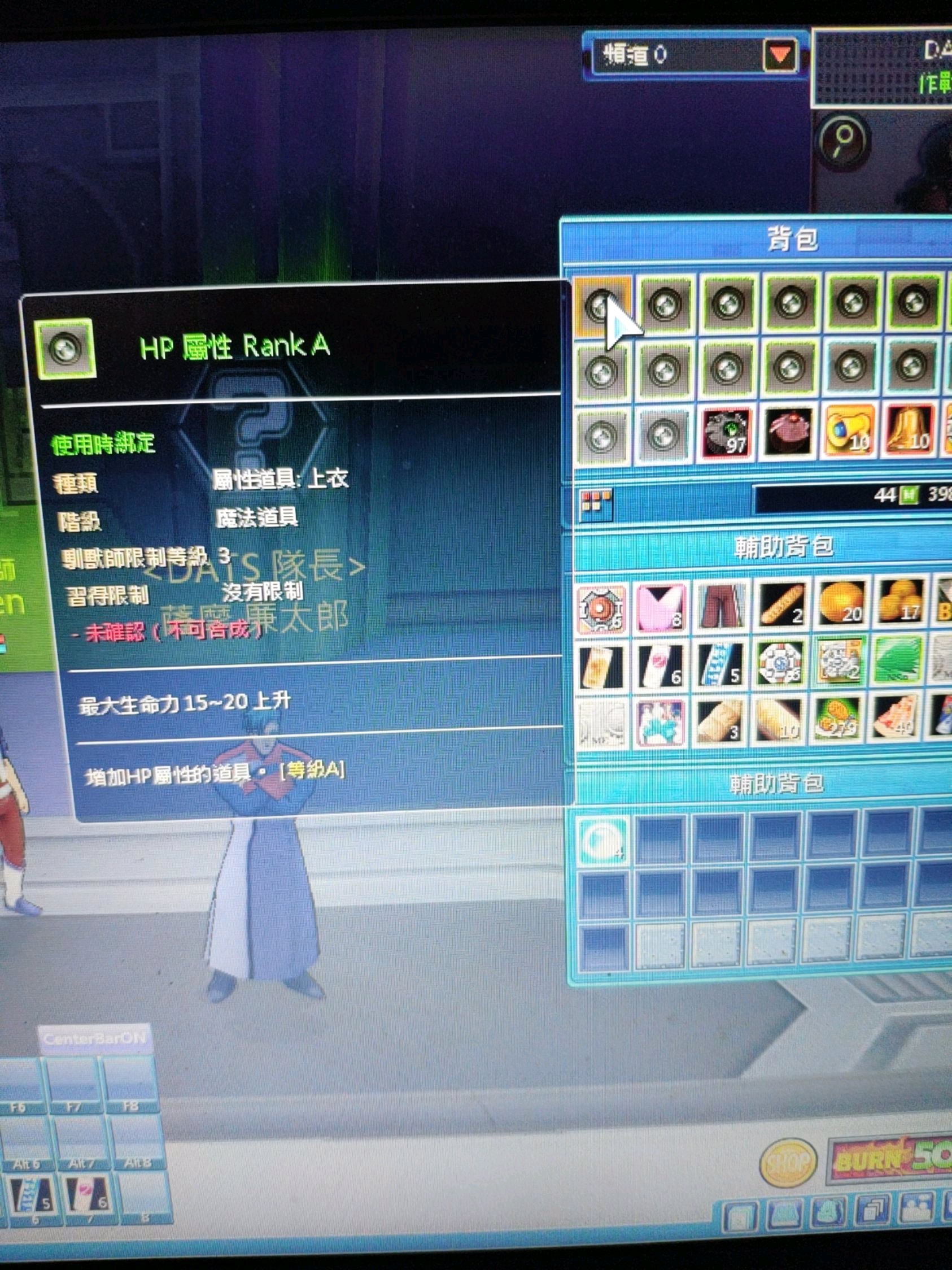 你背包前面两排多的是纽扣,这种是最低级的纽扣,用不上,没必要浪费钱去鉴定属性,可以丢掉。粉红叶子,右键给宠物吃,可以改变宠物大小(不是一定变大的,也可能变小),宠物能力会随大小一起改变