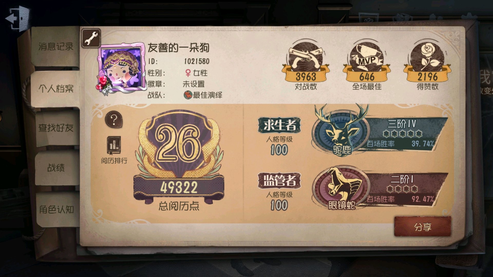 我好像是2016年七八月开始玩的吧,那时候先玩的守望先锋,后来厌了就玩了一段时间杀机,一开始也很菜,而且画风比第五人格恐怖很多嘛,就玩的心跳加速,后来去YY组队认识了朋友,教我溜鬼,带着我爬上人皇,后面改了小游戏之后我彻底不玩了,因为老是踩夹子吓得我一抖