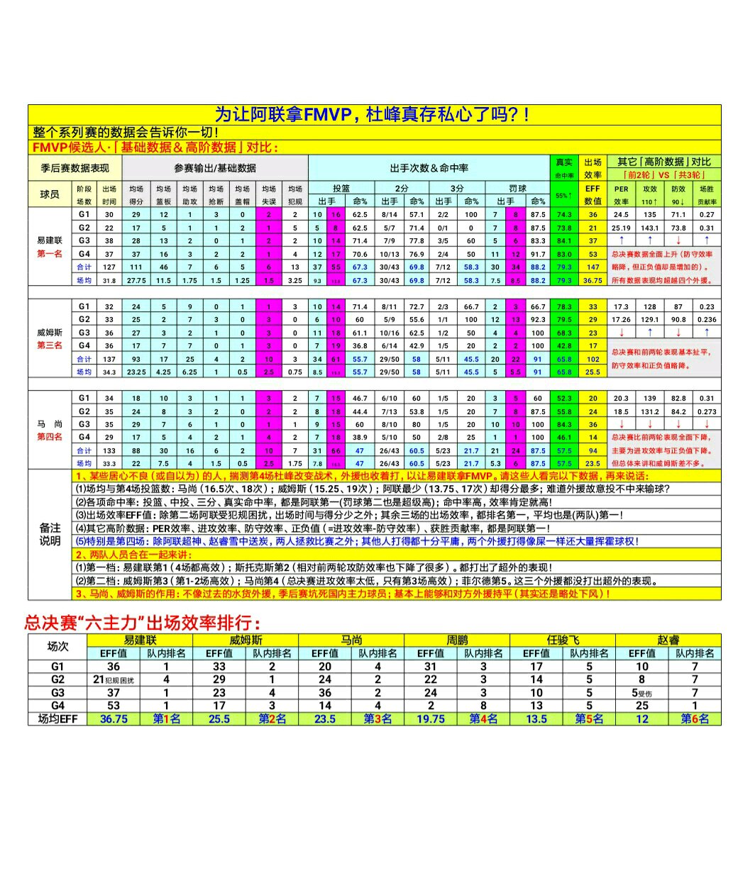 1、某些居心不良(或自以为)的人,揣测第4场杜峰改变战术,外援也收着打,以让易建联拿FMVP。请这些人看完以下数据,再来说话: