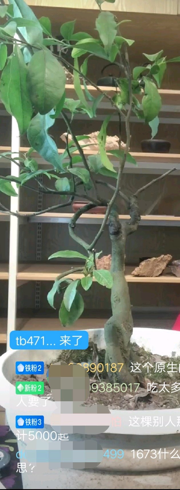 进去时正赶上准备拍卖熟桩,主播拿出一棵桩放到转盘上(见图三),寻莫半天找到一粒果,再确定了一下是嫁接,嫁接品种不详,主播犹豫半晌终于报出五张毛爷爷起拍,顿时有粉对该桩推崇备至,但迟迟无人出米,有粉与主播互动言及其当地这棵桩能到一Q多以上,终于有客出了四张半,主播不悦言道:如果这种桩别家一Q内能购到,她三天不吃饭,又有粉言道这棵桩人那儿都是五Q起,于时冷场半天,终于有老实人忍不住公屏留言,这桩市场不过两张吧……
