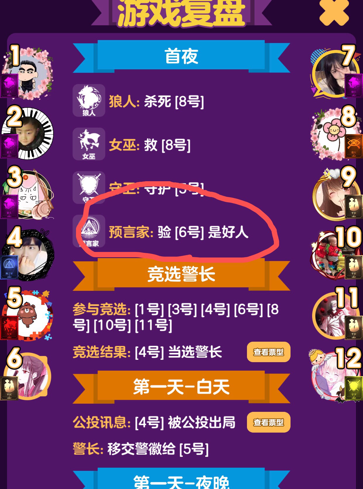 4验6是因为他已经知道几张神牌的身份了,而且会强势站边4。6没身份怕她发言不好被外置位人打是狼到时又要浪费去砸礼物生气,所以验一手6给她金水护体。