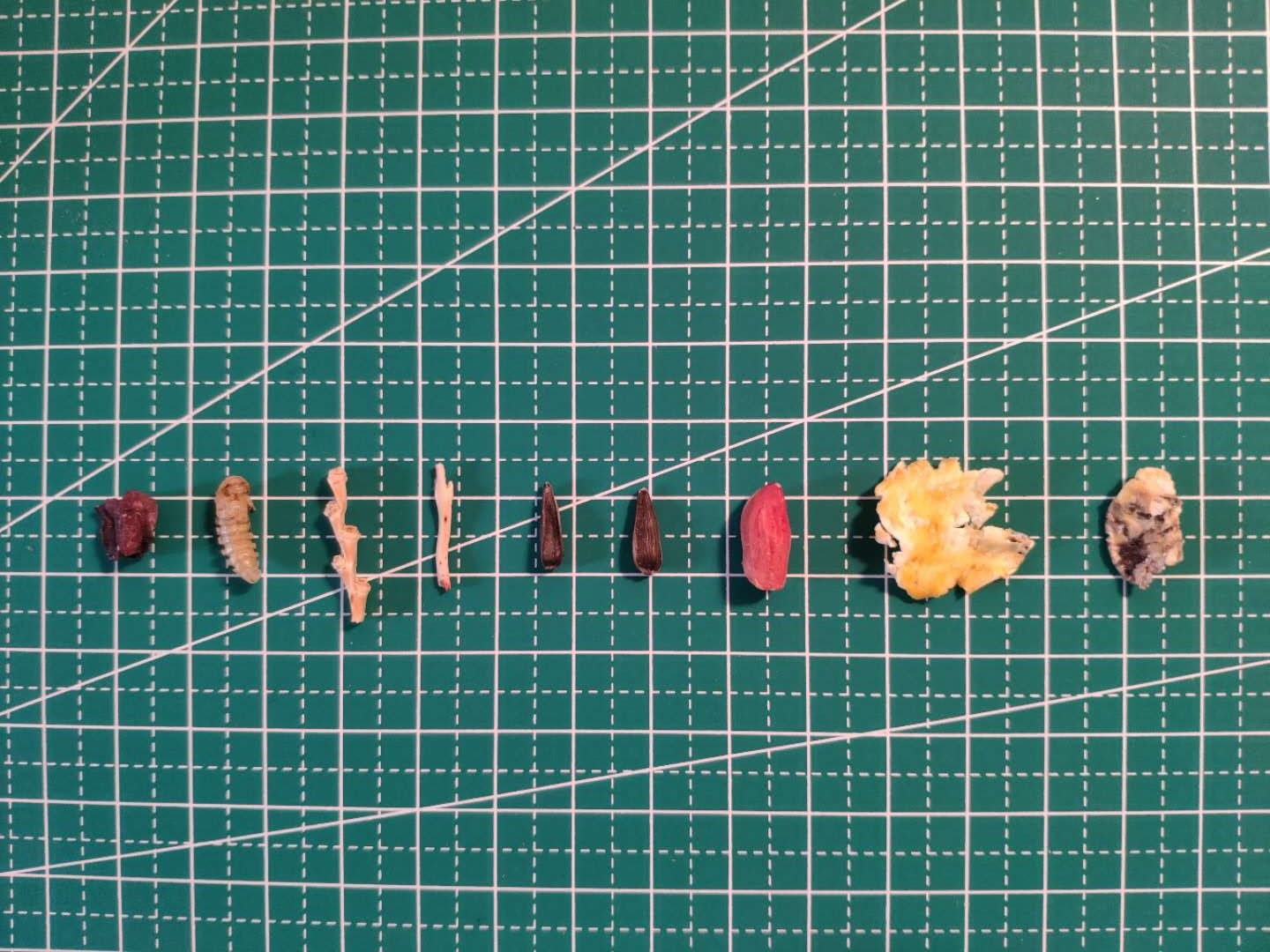 无法辨识的红色硬块,不知道是什么的虫子,谷杆?干瘪的瓜子花生,以及玉米片,和发霉的玉米片。