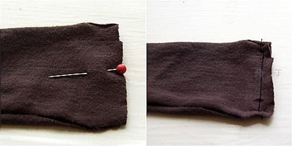 2、将布艺发卡DIY、发带DIY的原材料纵向对折,用大头针固定。布料的正面朝里,沿边缘缝上,剪去多余的布。