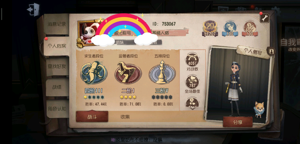 本人技术过关稳定三台以上 意识到位 救人基本不出现失误 开门战基本都会赢 主玩空军魔术舞女副玩盲女魔术调香 希望我的排位队友擅长佣兵 咒术 勘探 机械 其中之一 有一个能基本过关的补位角色(律师除外) 因为晚自习和下午第一节有课的原因 所以排位时间是周一到周五的上午十二点到一点半 晚上八点十分到九点 周六全天 周日中午+晚上八点十分到九点 对了偶尔号主妹子会来帮我打低保 玩匹配 因为这个号皮肤多我就用这个号一直在打排位 自己的号直播炸鱼用 这号单排胜率最高64% 有意加我