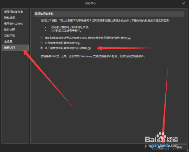 有没有大佬来解决一下问题呀!用word邮件合并通过outlook发送邮件,outlook总是出现警告怎么办!每发送一个邮件就要点一下允许……在查了百度后,进了信任中心更改了设置还是不行,似乎是防病毒软件显示有效的问题,求解!感激不尽!以下是百度上搜到的图,图上说防病毒软件是无效的。