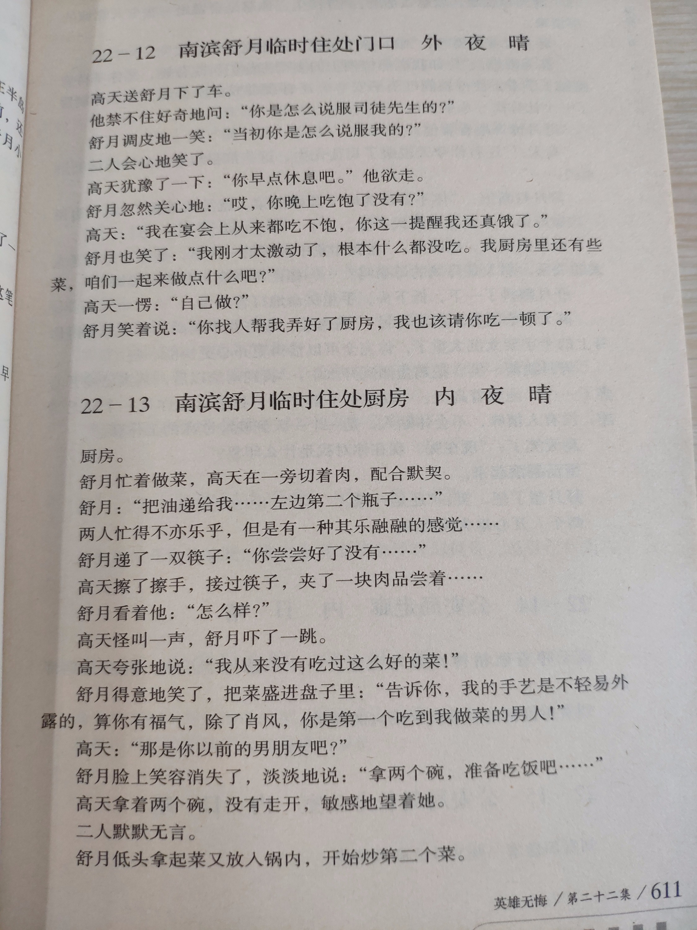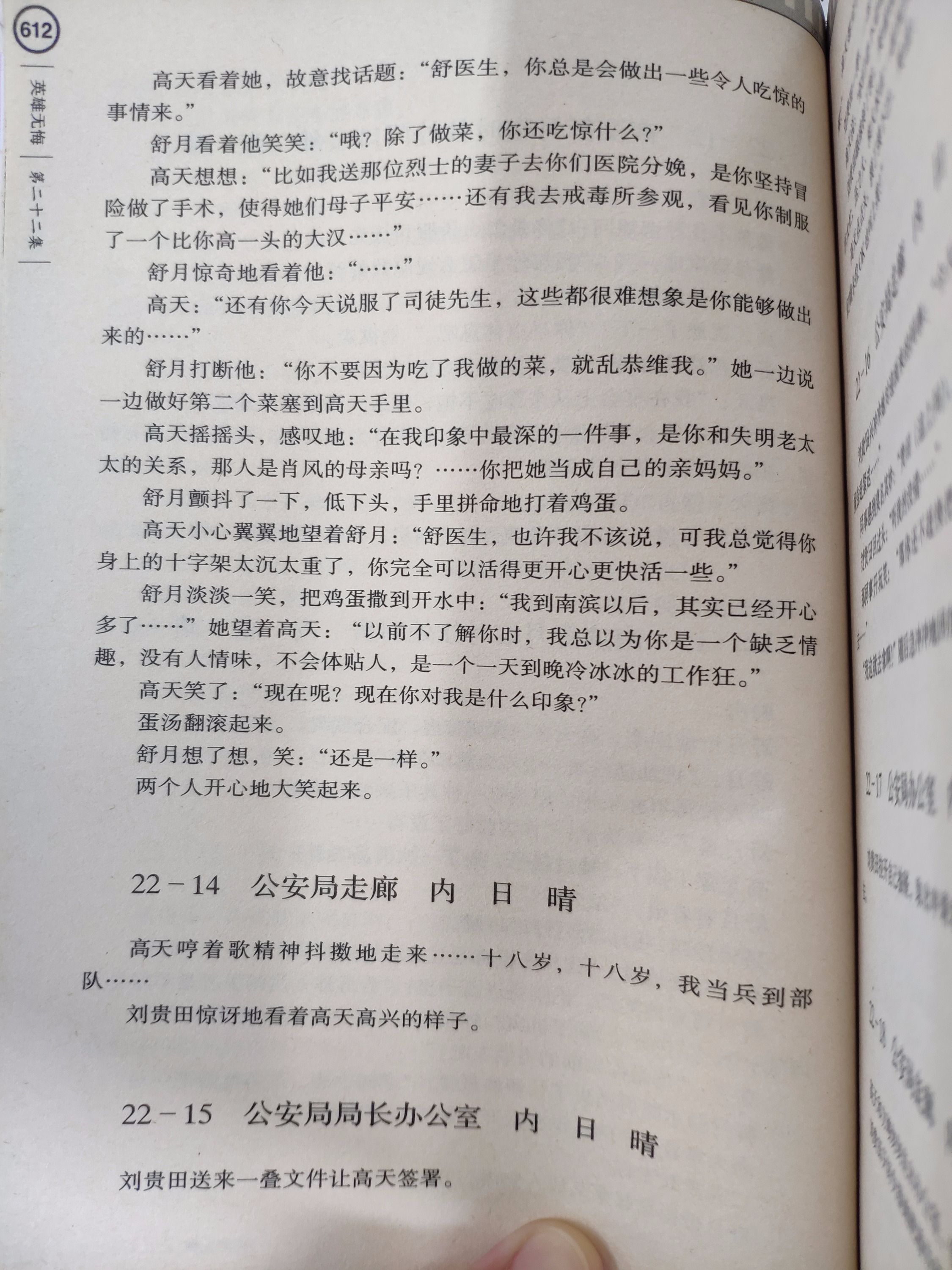 在孔夫子旧书网上淘到了,上下册,像是电视剧的剧本,但是有一些电视剧每拍出来。书上有几个场景——高天和舒月一起吃大排档喝啤酒,畅谈警察行业理想,两个人越来越志同道合;舒月带着吸毒患者检查乘车回来出事儿,高天赶到,然后舒月休病假在家,高天特意安排二姨照顾舒月……