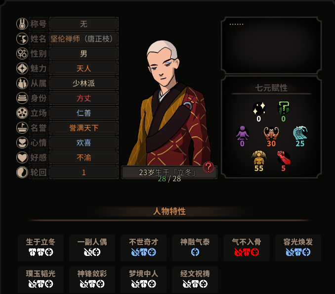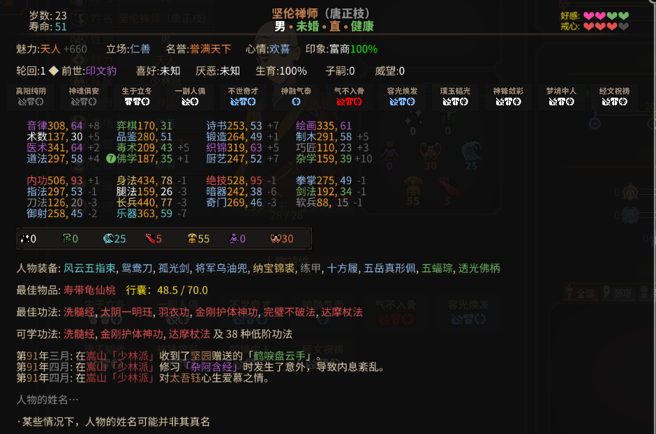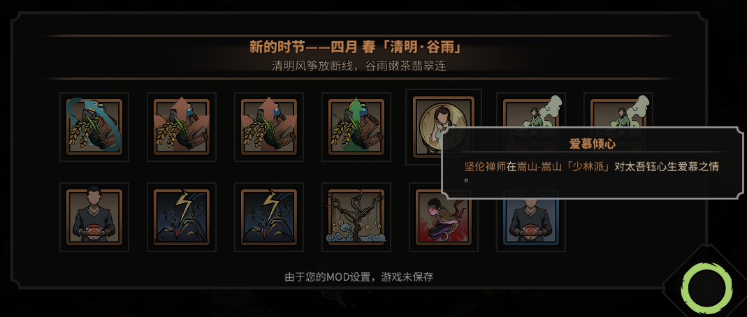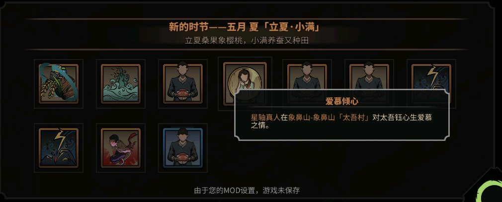 拍屏警告,这是我当时不懂事,下了太吾想过平静的生活mod,然后没有关,进游戏足足点了一个小时,救了所有入魔人,然后就这样了,恩深意重那栏有三代太吾,入魔人活的久,关系那栏基本上没人,然后就会这样了