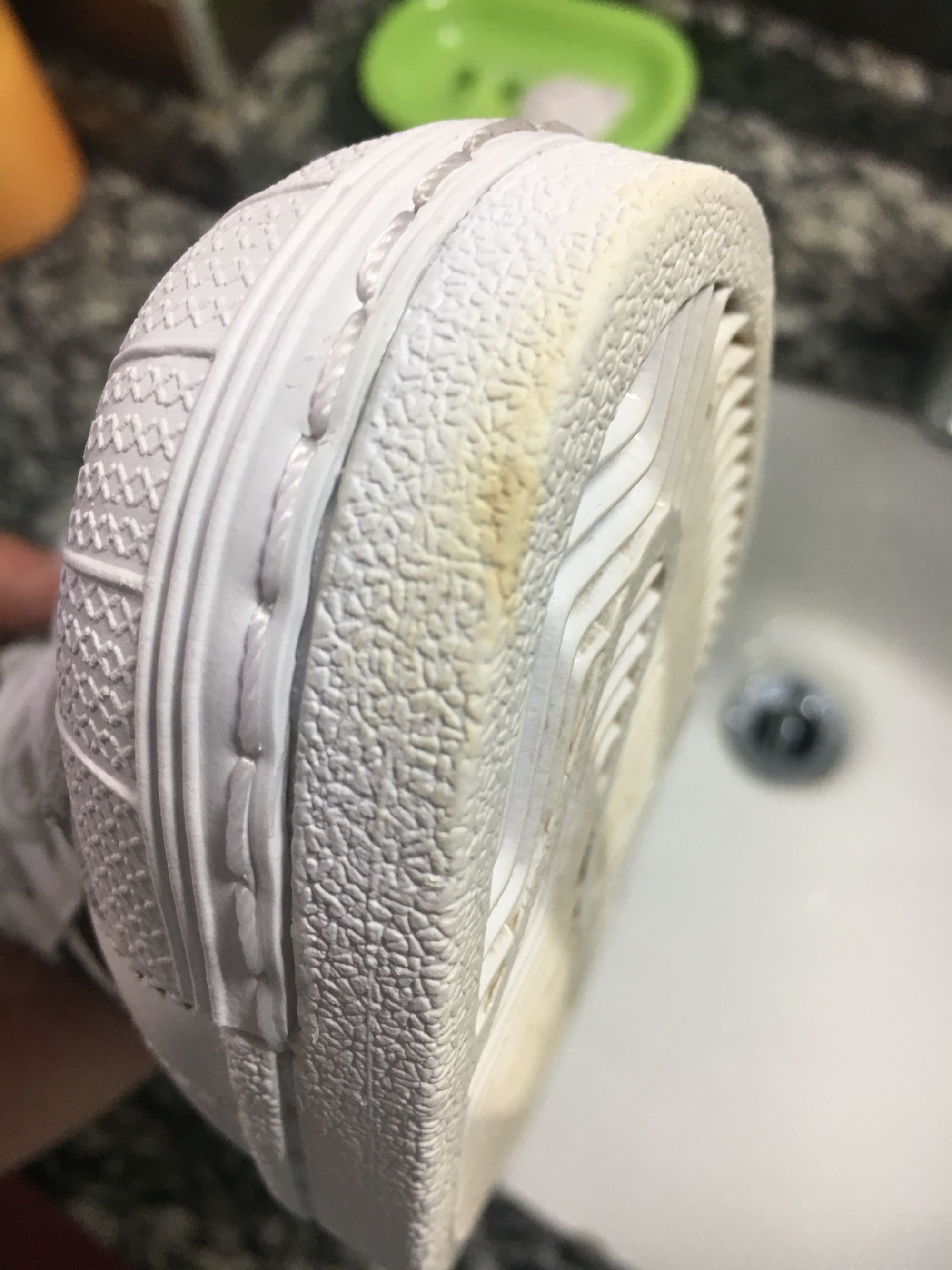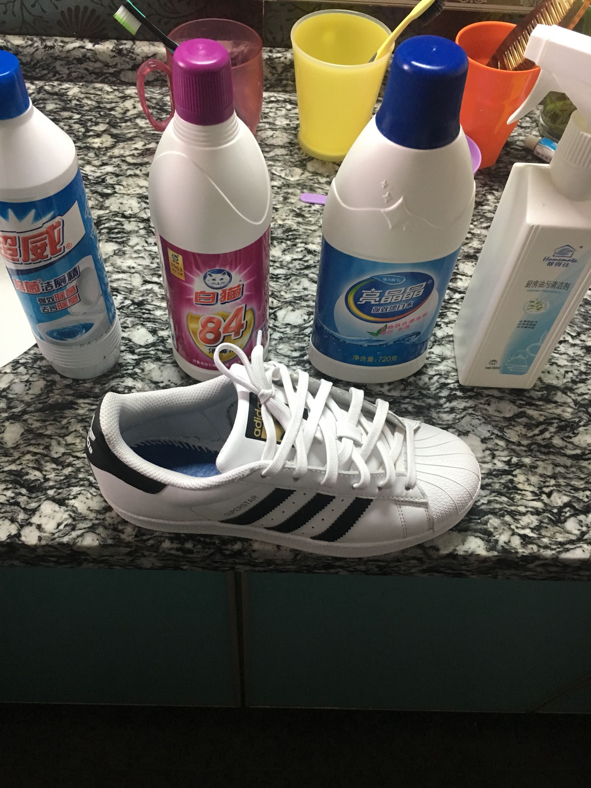牙膏,84消毒液,强力漂白剂,厨房油污清洁剂等全试了。大家以后,别去踩泥土。部分泥土里含有一种那黑色物质。