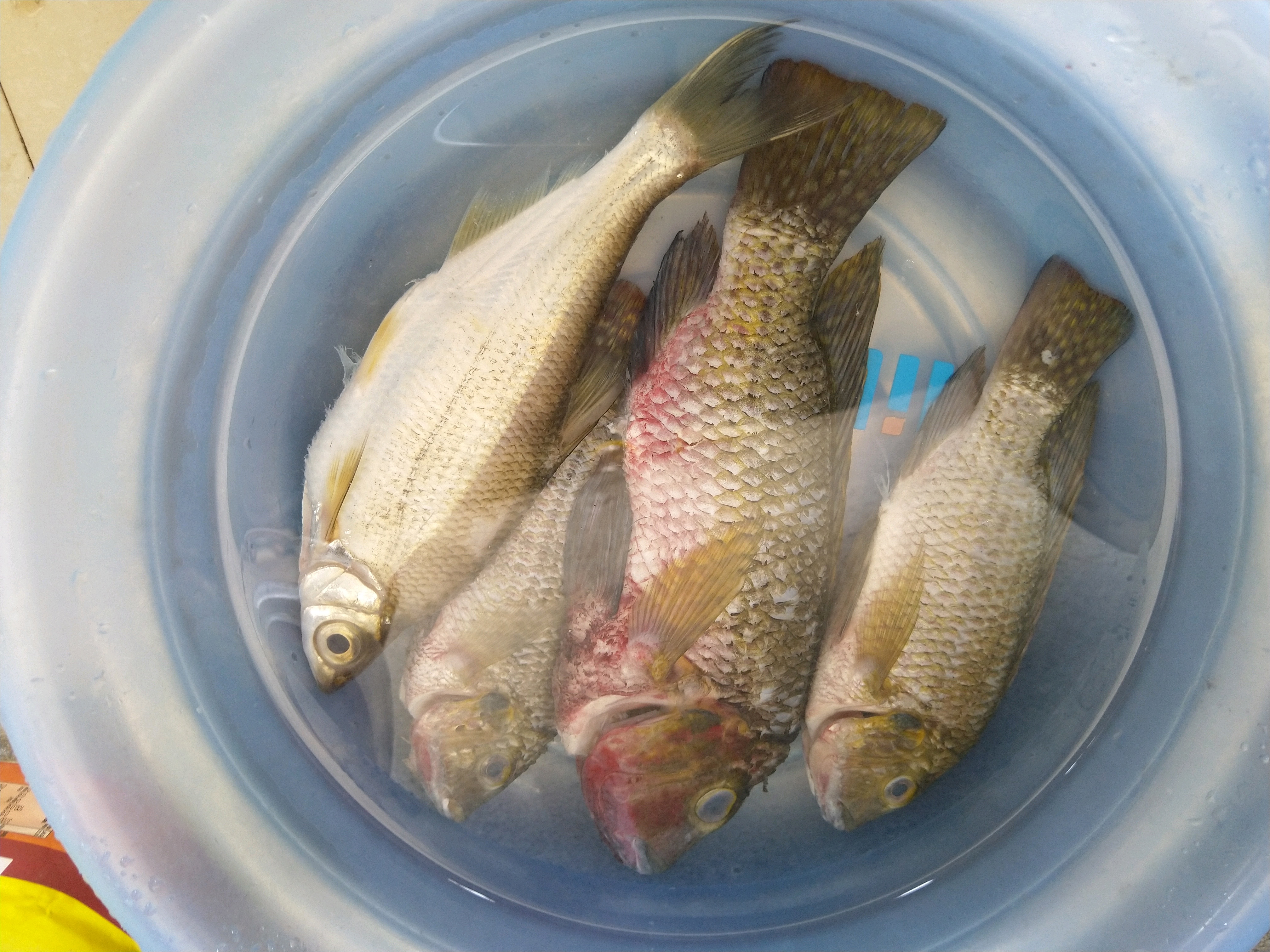 图中那只尖头,眼睛有点大,眼珠很黑,整个都是黑眼珠,鳞片亮银色,图中是杀好待下锅的,旁边三只吉利慈鲷就是俗称罗非的就忽略吧!