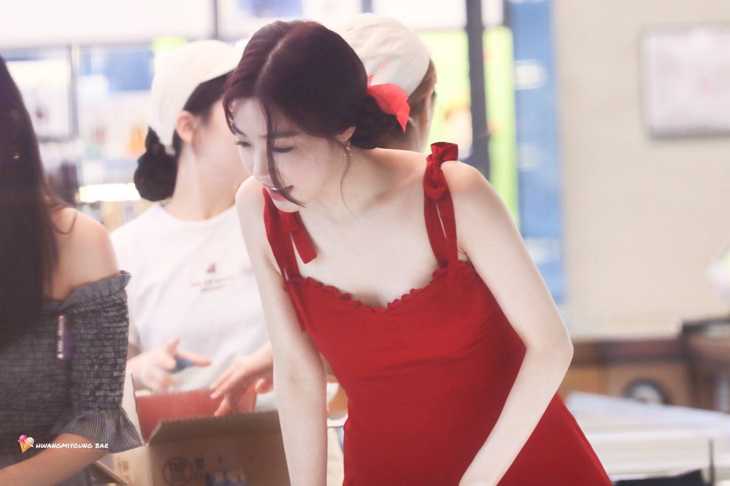 今天黄美英穿的很漂亮,大红色的短裙,两个啾啾用红丝带挽在脑袋下面。