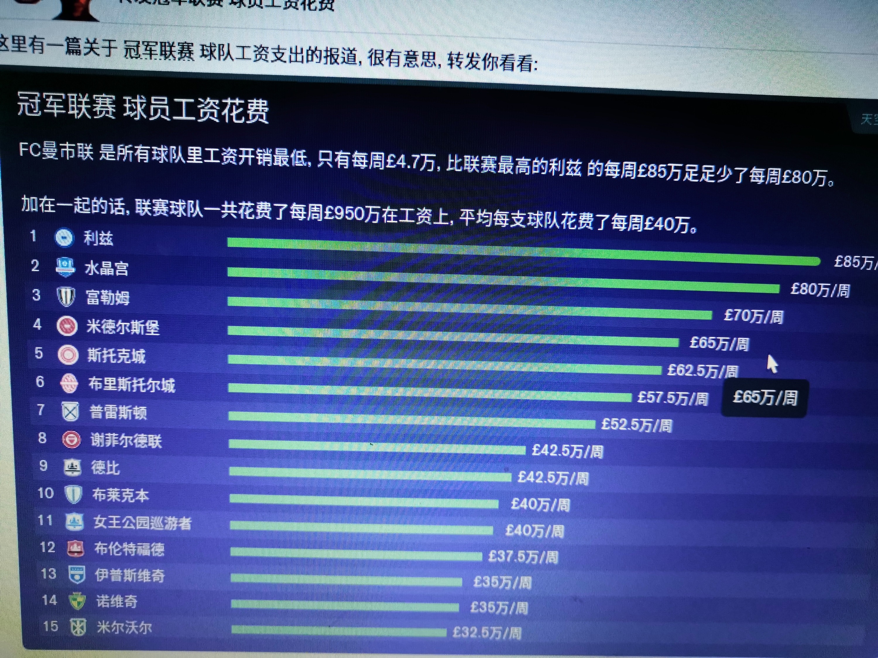 前两天看到头条上有人直播玩联曼,标题是“第六年了,联曼到英超,争取欧冠资格”,我感觉也太厉害了吧,我带联曼已经五年,北部组第一,全国联第一,英乙第一,英甲第二,现在在英冠打了8轮积16分排第六,现在打英冠都恼火,球队声望太低,只有两颗星,有些球员宁愿去英乙都不来英冠的联曼,财政资金也没有,转会预算也低,我队自己的球员最高的才一个45万英镑的,别人队伍里一个一线队员的身价能买我一只队,真的不知道那些六年联曼的大神是怎么做到的,真心请教怎么提高球队声望啊,不然真的没有球员愿意来。
