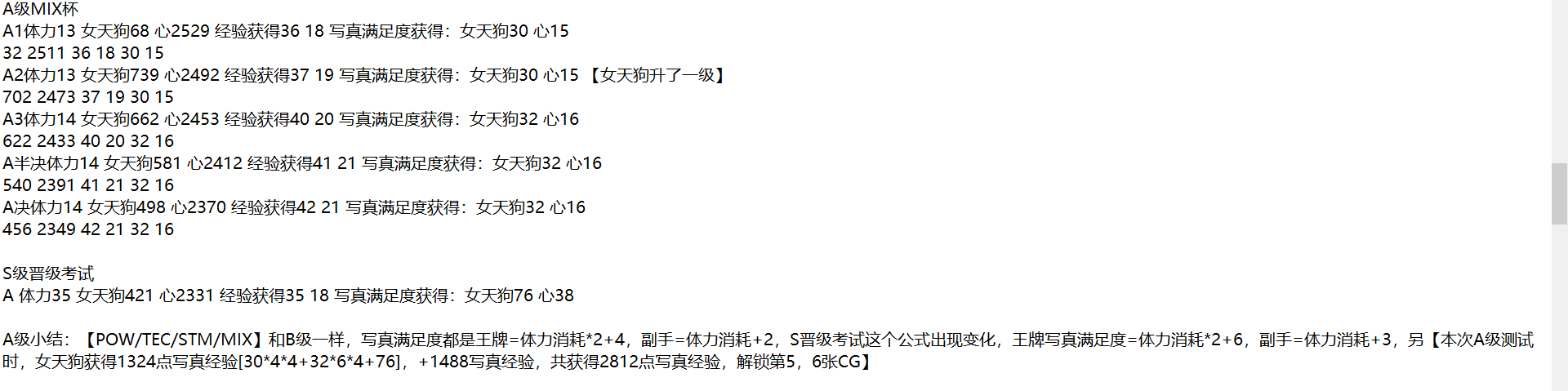 5.特指王牌情况下,【主要】关卡中的【F/E晋级/E/D晋级/D】关卡遵循[写真满足度=体力消耗]的公式,【C晋级/C/B晋级/B/A晋级/A】关卡遵循[写真满足度=体力消耗*2+4]的公式,【S晋级/S2/S3/S半决/S决/SFINAL杯】遵循[写真满足度=体力消耗*2+6]的公式,S1是个让人奇怪的关卡,在S级却遵循[写真满足度=体力消耗*2+4]的公式。