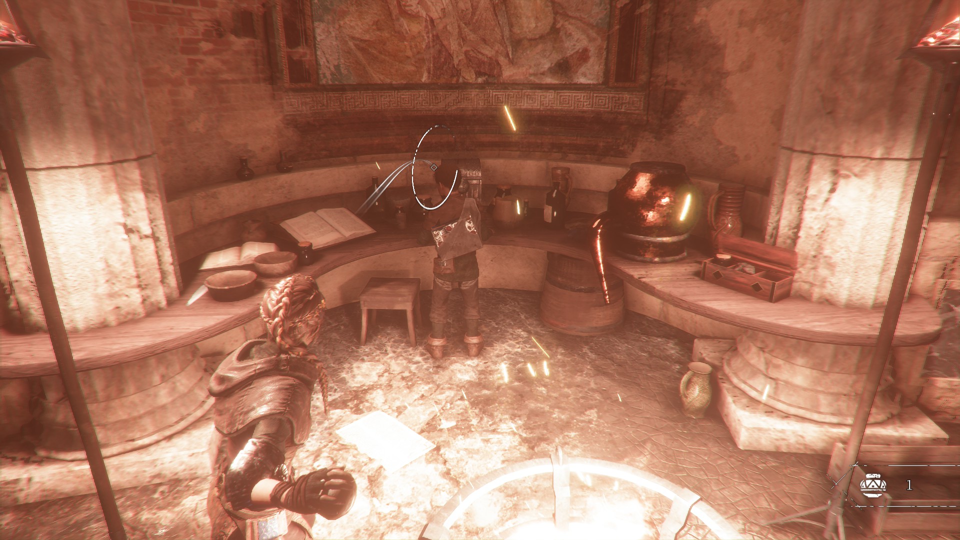 大厅中间有个可以转的把手,控制火盆的,卢卡斯会在几个工作台走动,然后就剧情了