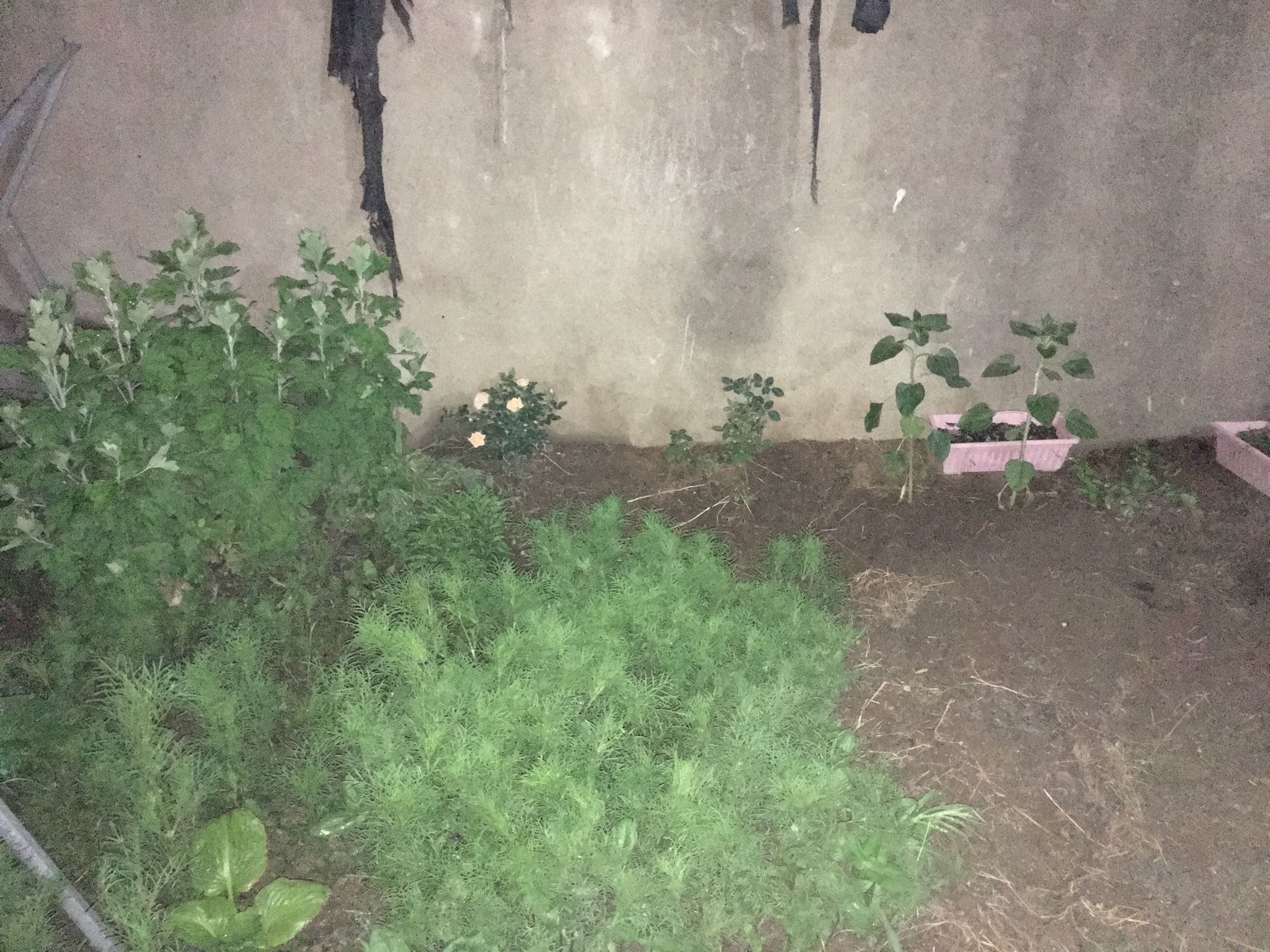 之前院子没栽那么多花 于是撒了好多花种子 后来 发现 估计是买到宿迁种子再加上怕挡月季的阳光 就拔了 就剩中间那一窝