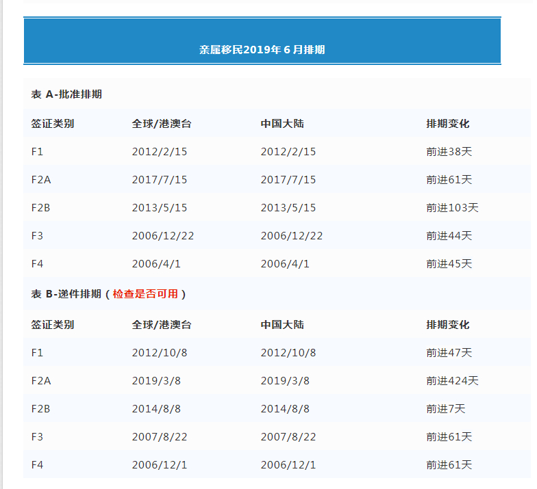 2019年6月最新美国移民排期表-