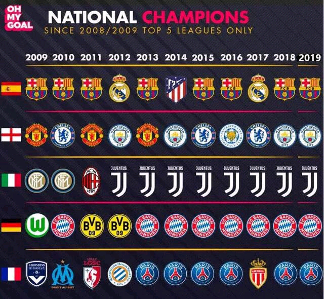 联赛冠军被垄断,拜仁毁了德国足球,巴萨毁了西班牙足球,尤文图斯毁了意大利足球,
