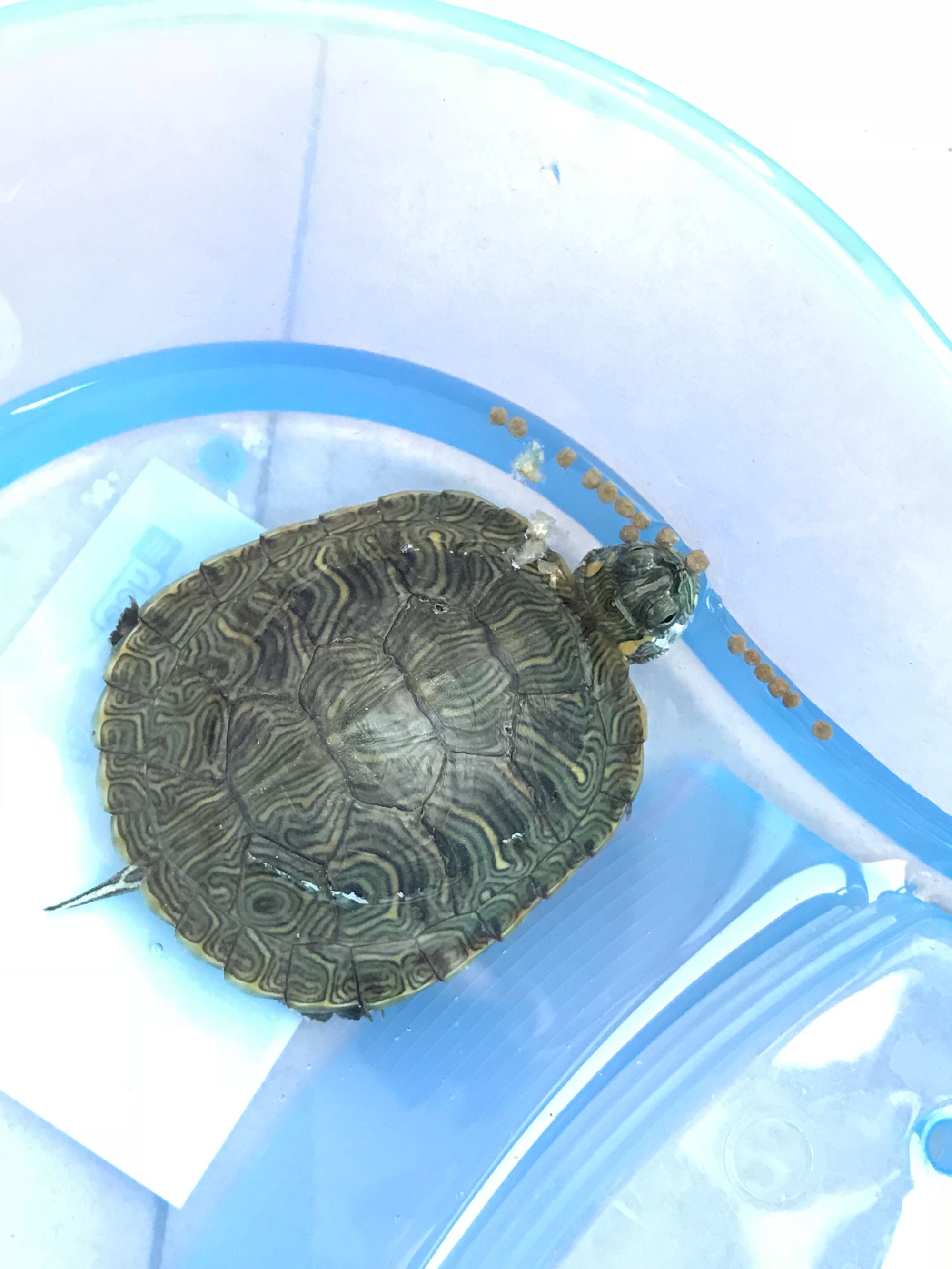今早喂它,进食了,很开心。用双氧水把它屁股洗了洗,就是你说像是腐皮的地方,还有龟壳上的小洞,眼睛也有点肿,捞出来干养的时候有点红,很明显,滴了三天的护眼液。感谢,感谢哈!