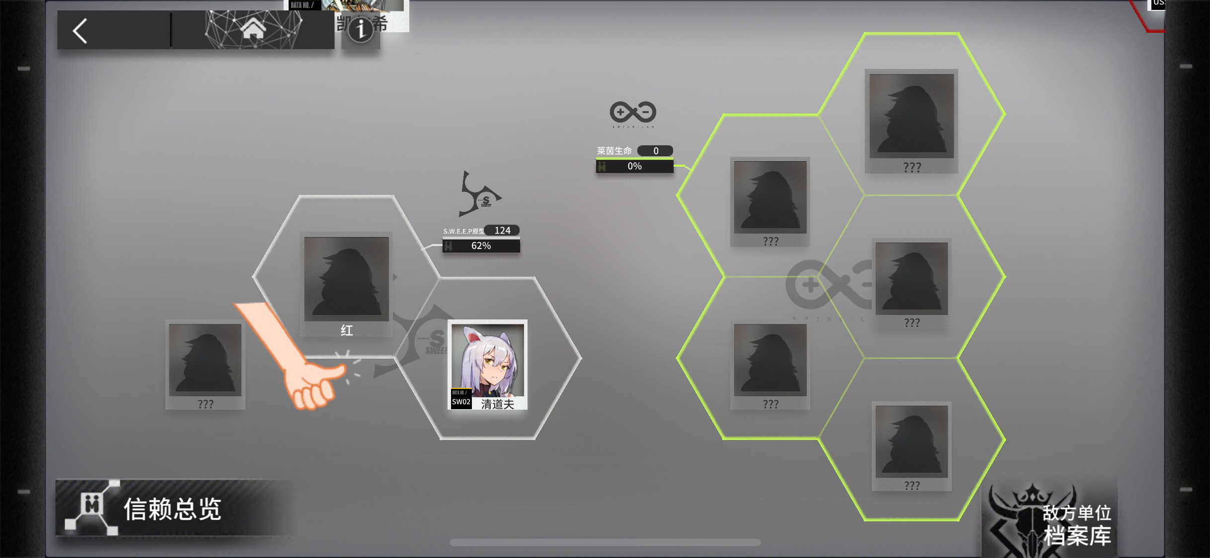 嗯?这是咋回事?没招募到的干员底下不应该是问号吗?为什么红这里就显示名字了?难道红已经悄悄的来到了我的骡子岛?