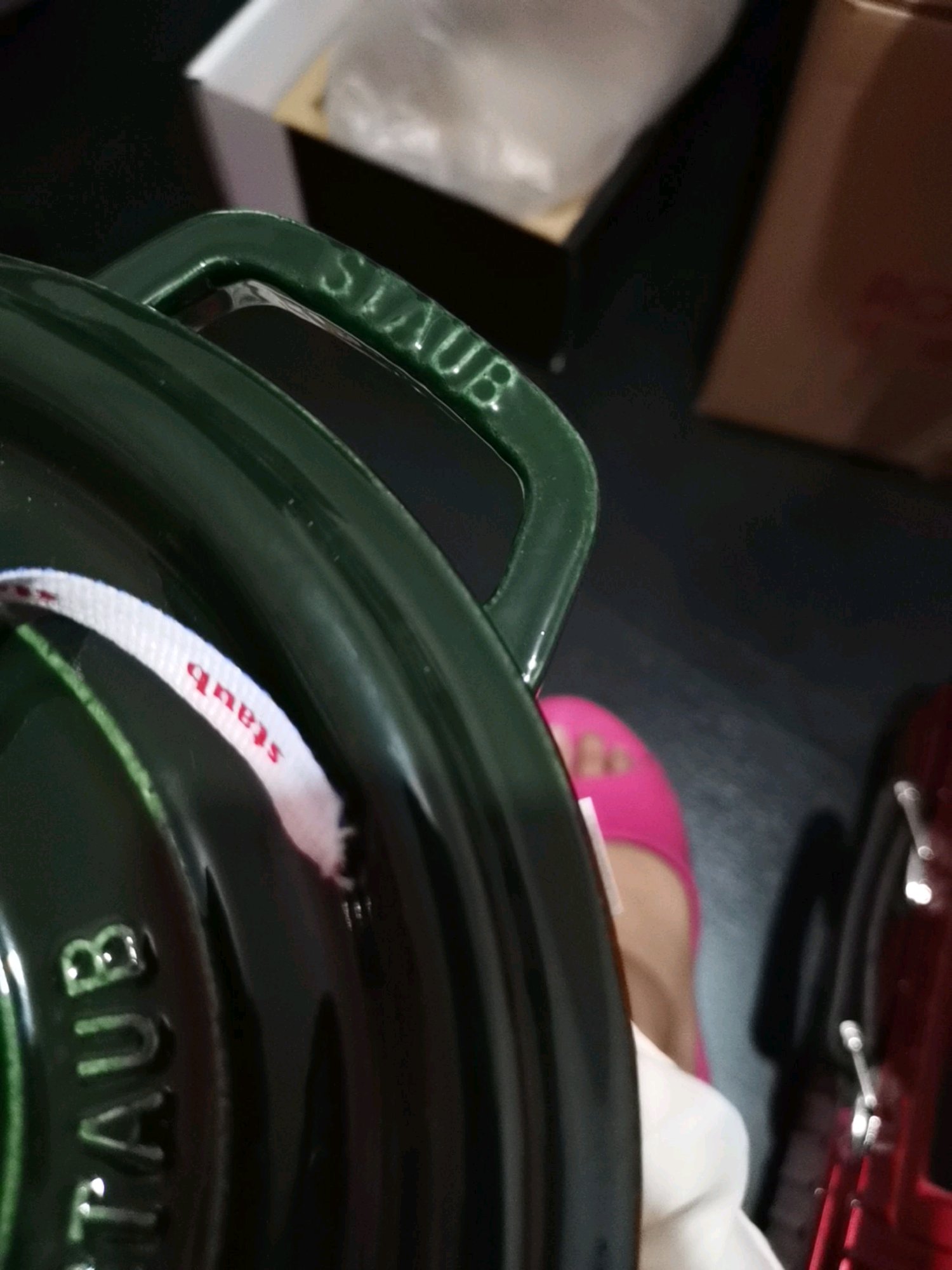 这个绿的应该是假的。我有个绿色款26寸的,色泽比这个好太多。这个颜色不正,色泽不对,还有把手上STAUB的标也不对