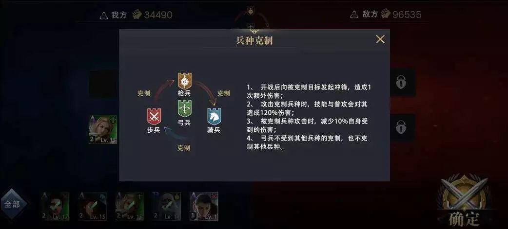 同时,演武场中遵守兵种间的相互克制原理,领主们在挑战敌方领主时,要根据对方的防守指挥官和亲兵配置,选择出战的指挥官。演武场中的战斗全程为自动战斗,当领主挑战成功时将与对方交换排名,若规定时间内没有决出胜负则视为挑战失败。