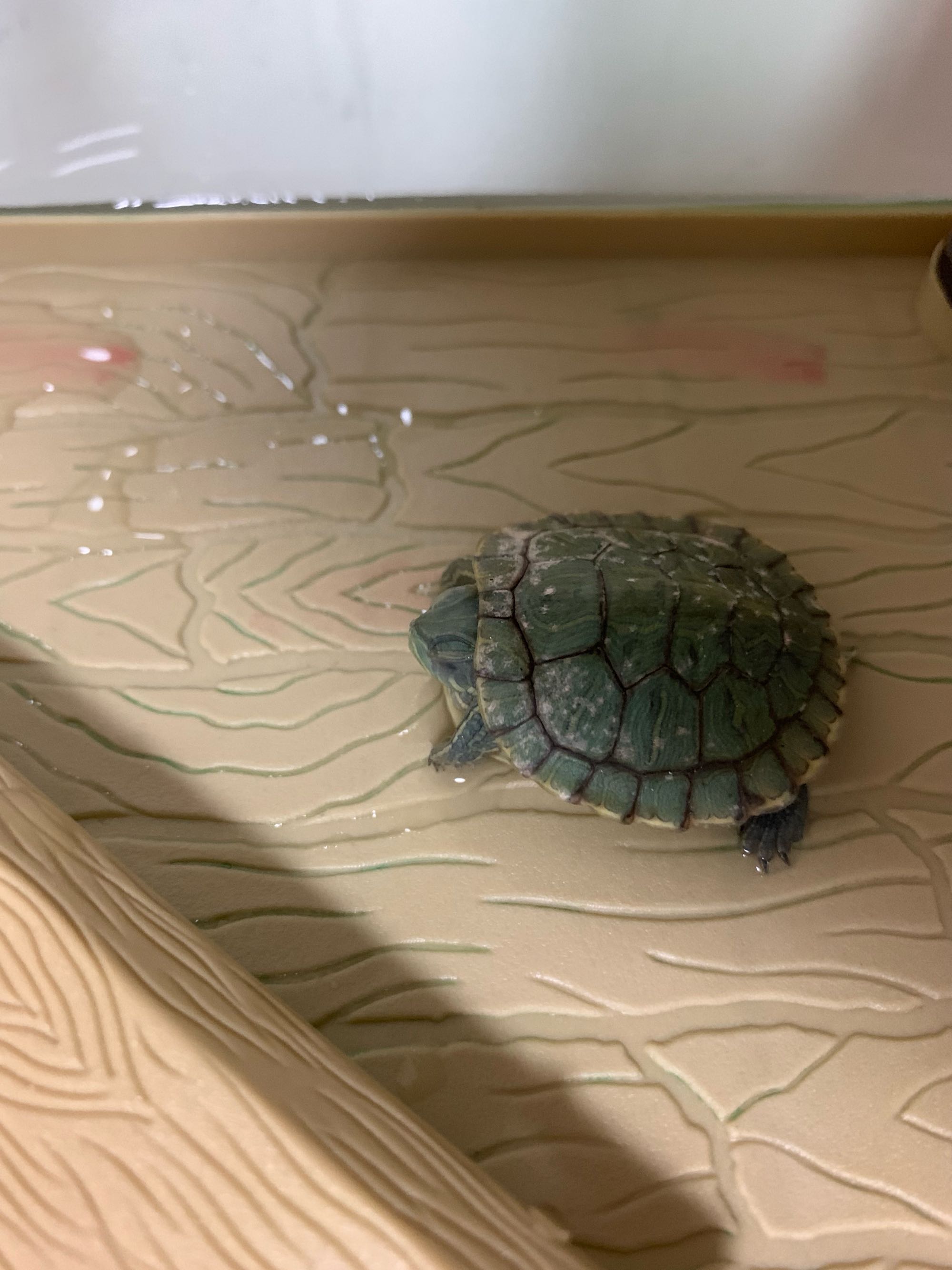 请问巴西龟背甲这样正常吗?还是病了?养了2周,每天吃东西正常,今天换了新缸它自己没有下水,干了2小时发现这样的。