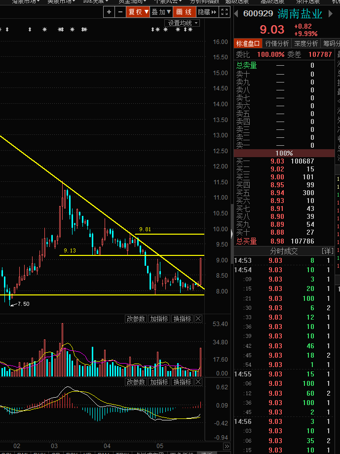 早盘股湖南盐业:今天午盘后涨停,上方压力在9.13-9.81 。不能封板 应该也是在涨5%左右获利了结,假如低开在9.13以下 现价了结