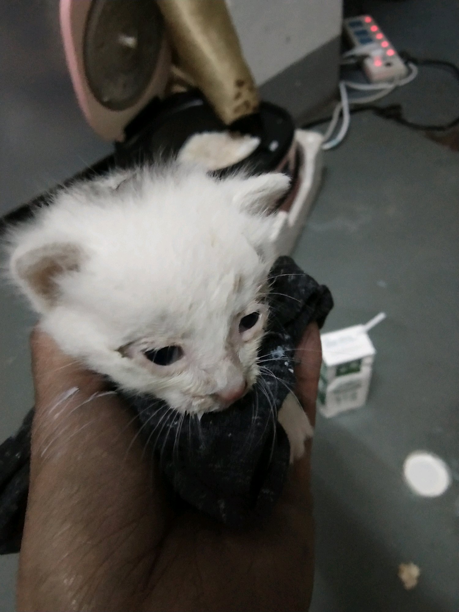 今天下班在路边捡到一只猫咪。跟我手掌差不多大,眼睛都睁不开了,好可怜,我就带回来了,好多眼屎清理了一下喝了点牛奶可是不吃动西,怎么办,而且它很会叫。求各位大佬教教我。准备喂几天就给放到回原位
