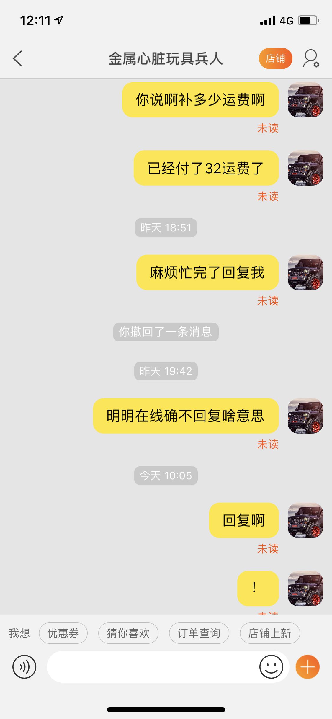 关键运费多花我也认了,毕竟秒价,但是他装死不回复我了,就算后悔了也要告诉一下吧,我生气的是这个店对人的态度