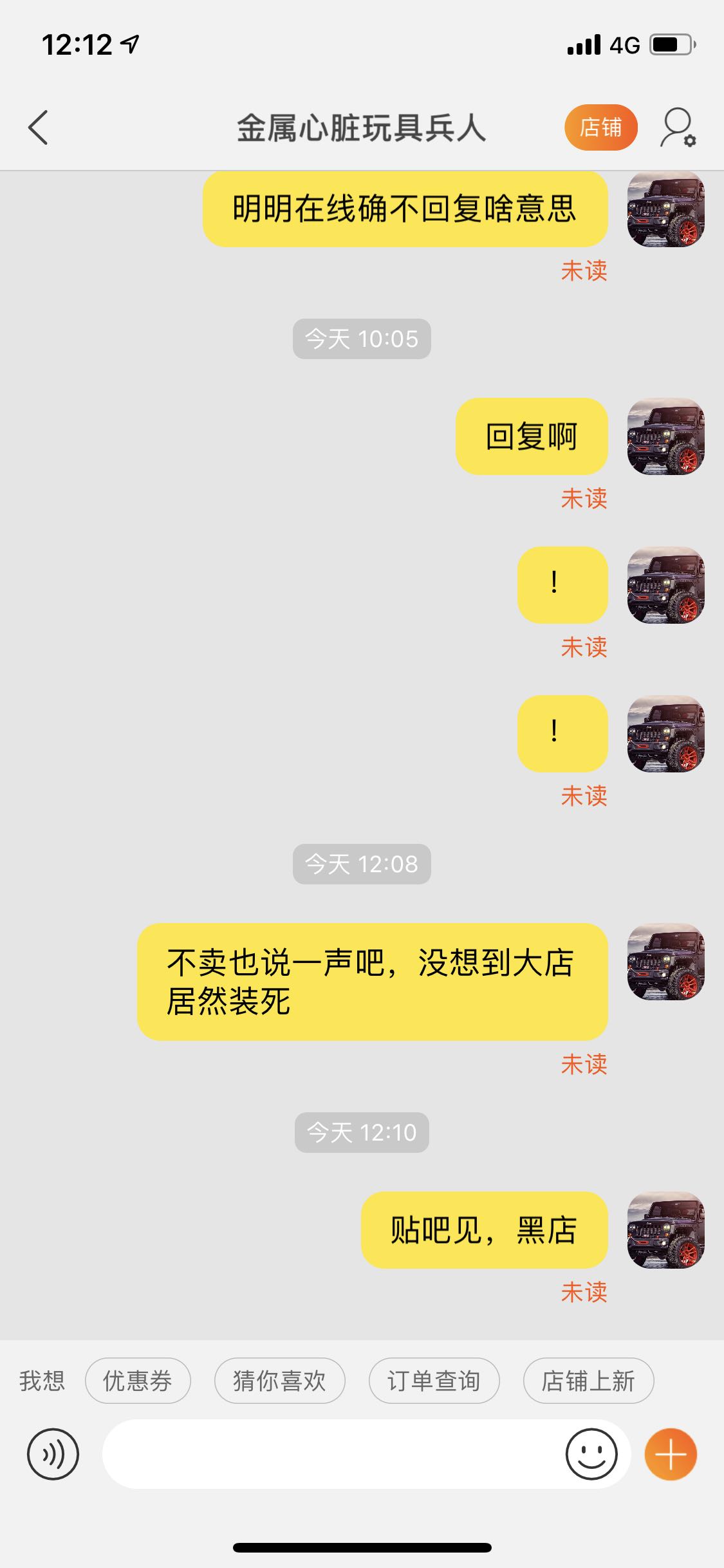 表一个黑店,金属心脏玩具兵人,昨天淘宝看见王座三件套秒价,想给武松配,秒下单付款,结果客服想用运费高来骗我,后来就开始装傻,不回复,朋友在线说话就回答,就算后悔了,你也得说一句吧,我又不是非让你卖我,这个态度是什么装死?退了可以但是也得说明原因吧