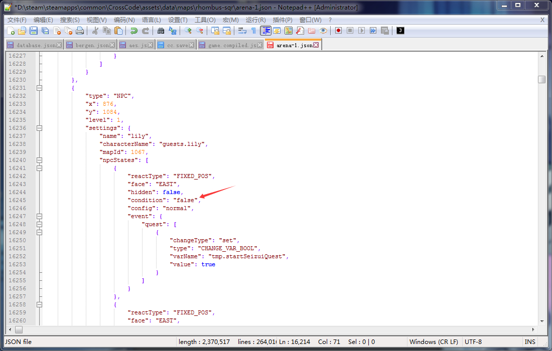 打开游戏文件夹至CrossCode\assets\data\maps\rhombus-sqr,然后打开里面的arena-1.json文件