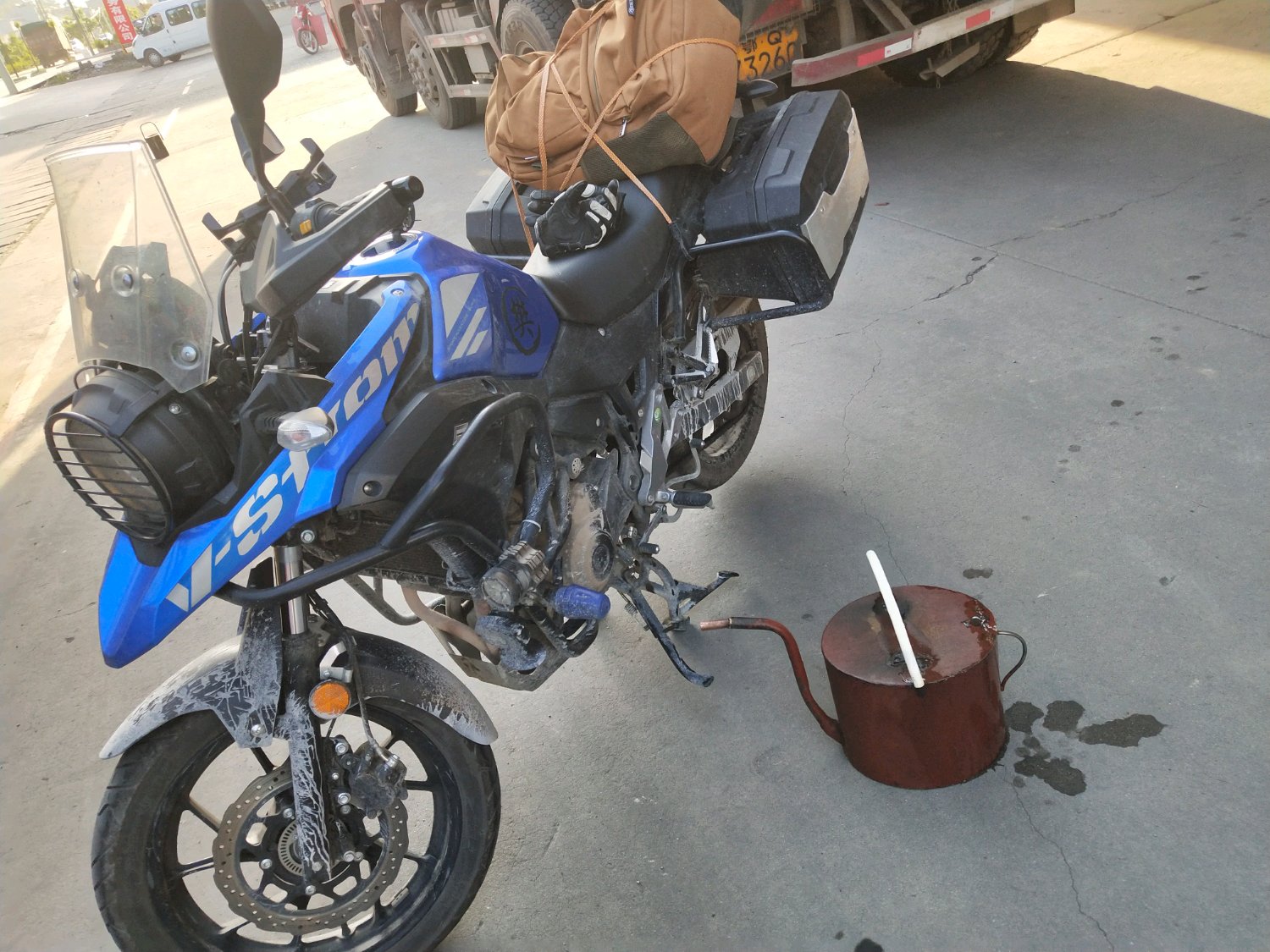 今天从江西出发穿过了湖南湖北骑行了800多公里,才停下来吃饭,明天进山城重庆,这边加油也麻烦要自己拎着尿壶一样的桶加[憨笑]