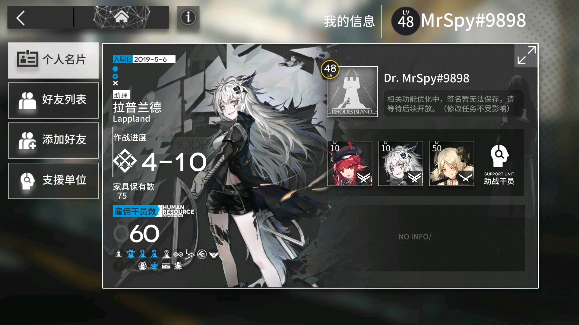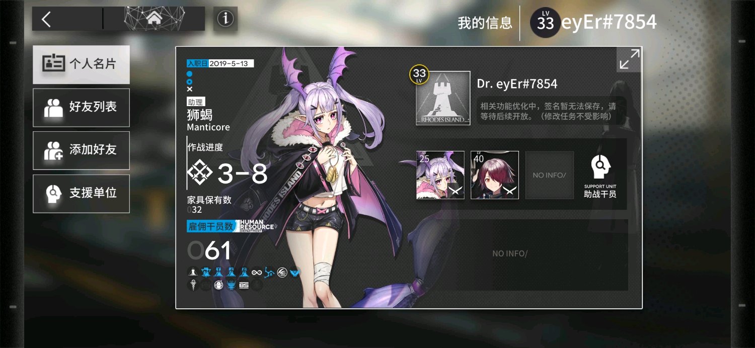 我b服!我新玩的!求个好友!等我龙门币够了就可以开第二个支援位!