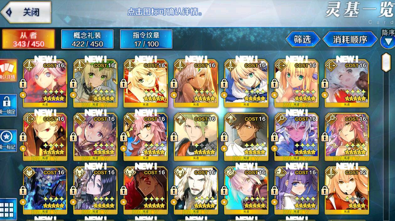 16活加上这期17活,差个太太全活,练度差qp升心脏160多个,结晶41个圣杯20个,礼装双宝石6090
