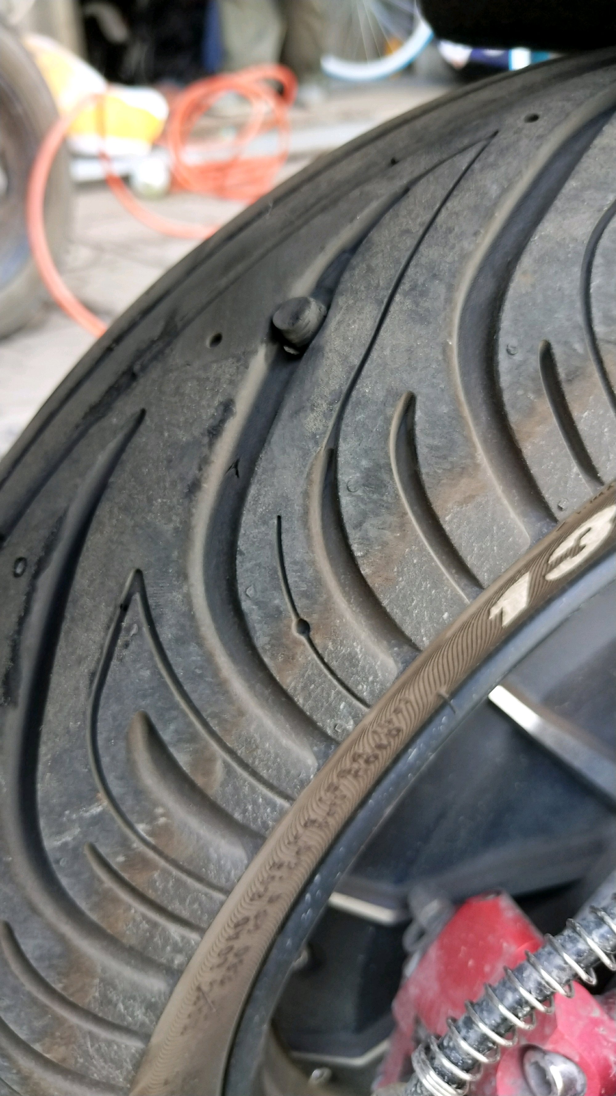 我大概需要买一包辣条备用了。上个月才打的蘑菇钉,这个月又打了一根辣条……提醒一下想买鲨鱼王的朋友,这胎,他防滑不防刺啊,太薄太软,一碰就破,小石子全都深深的嵌进去了。