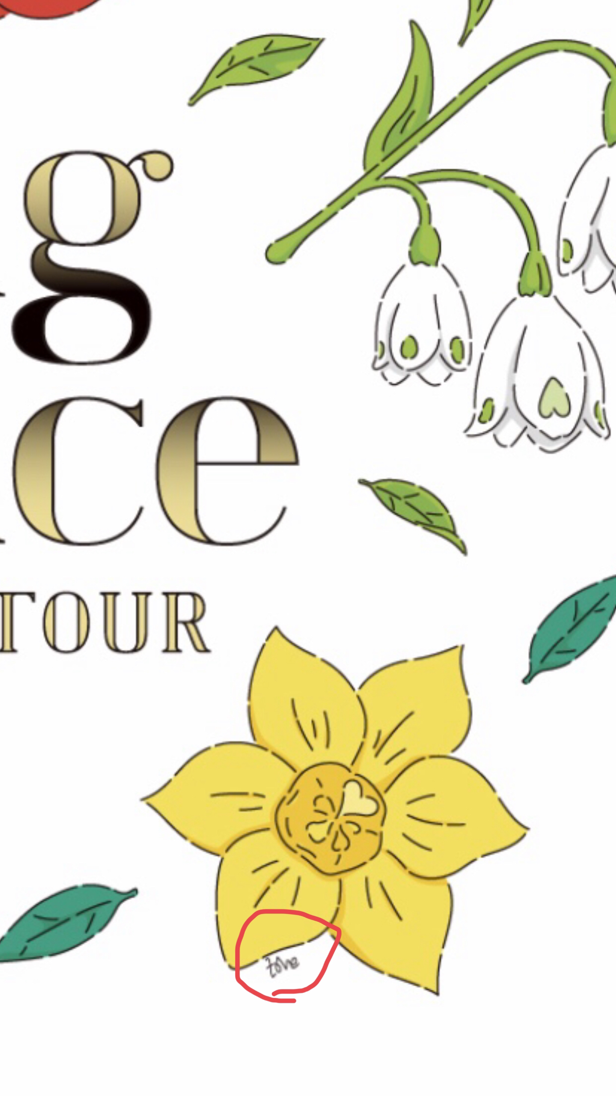 图片放大看 每朵花上都有心形图案 黄花下还用细线绘出love的字样