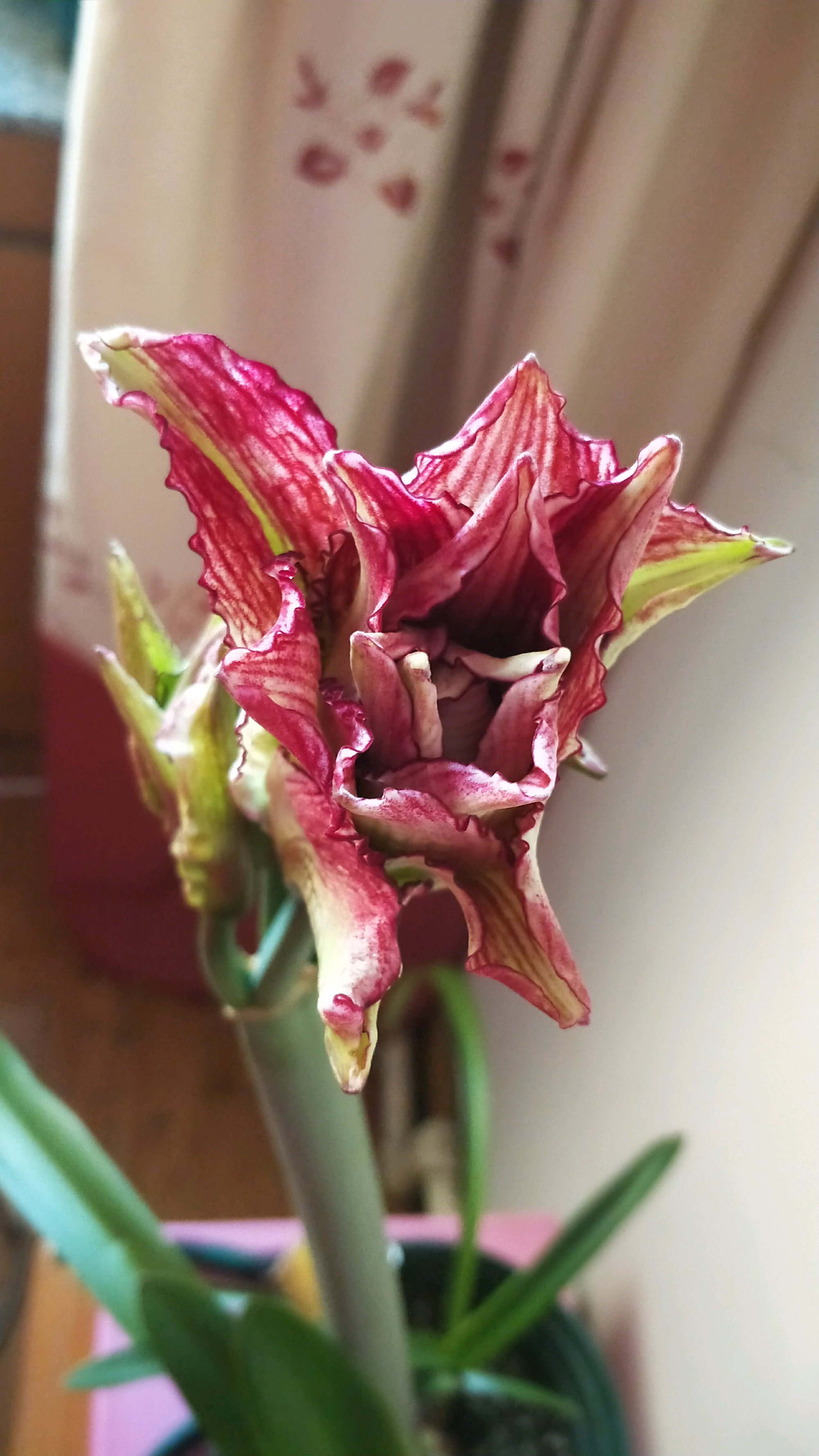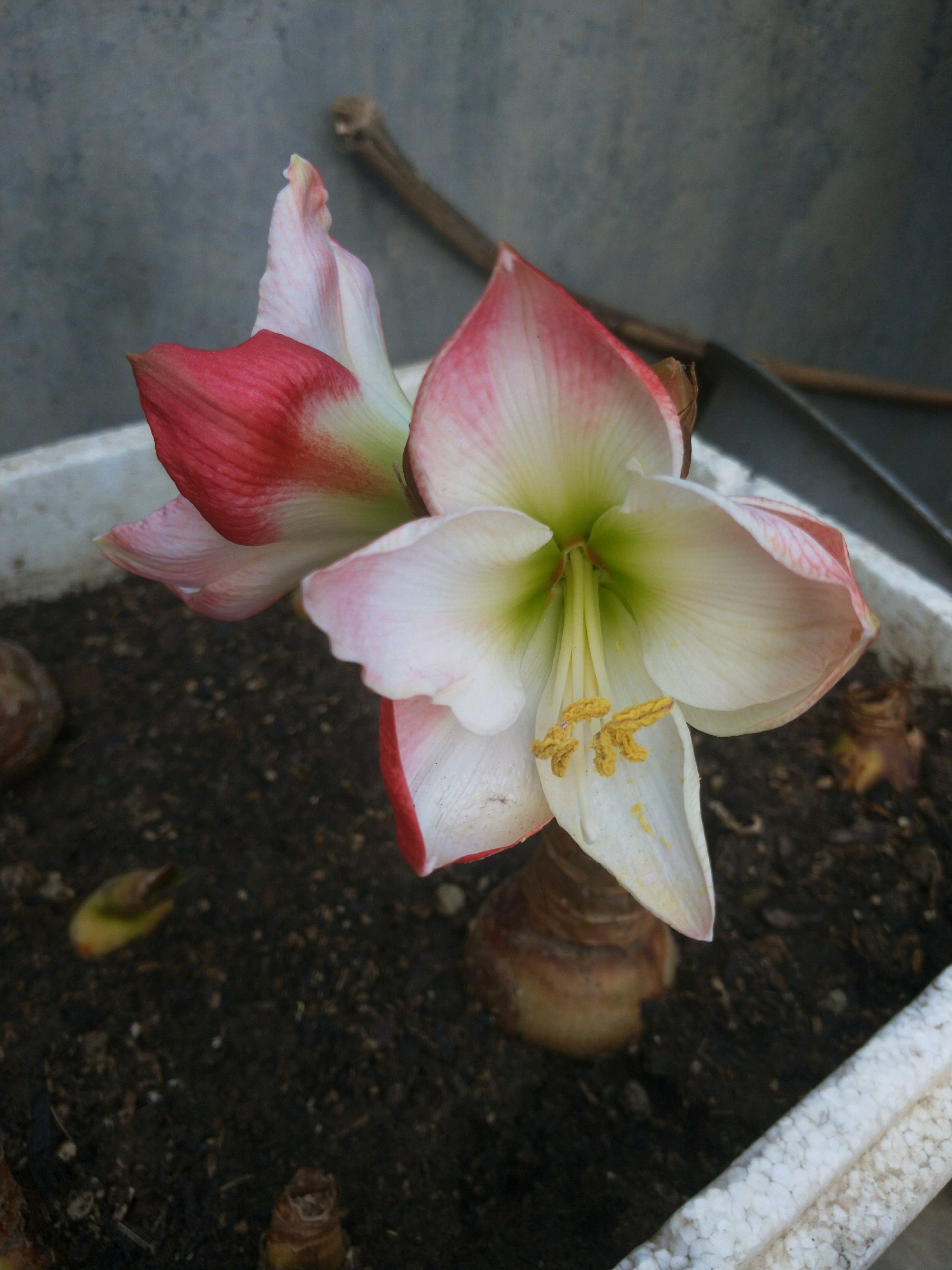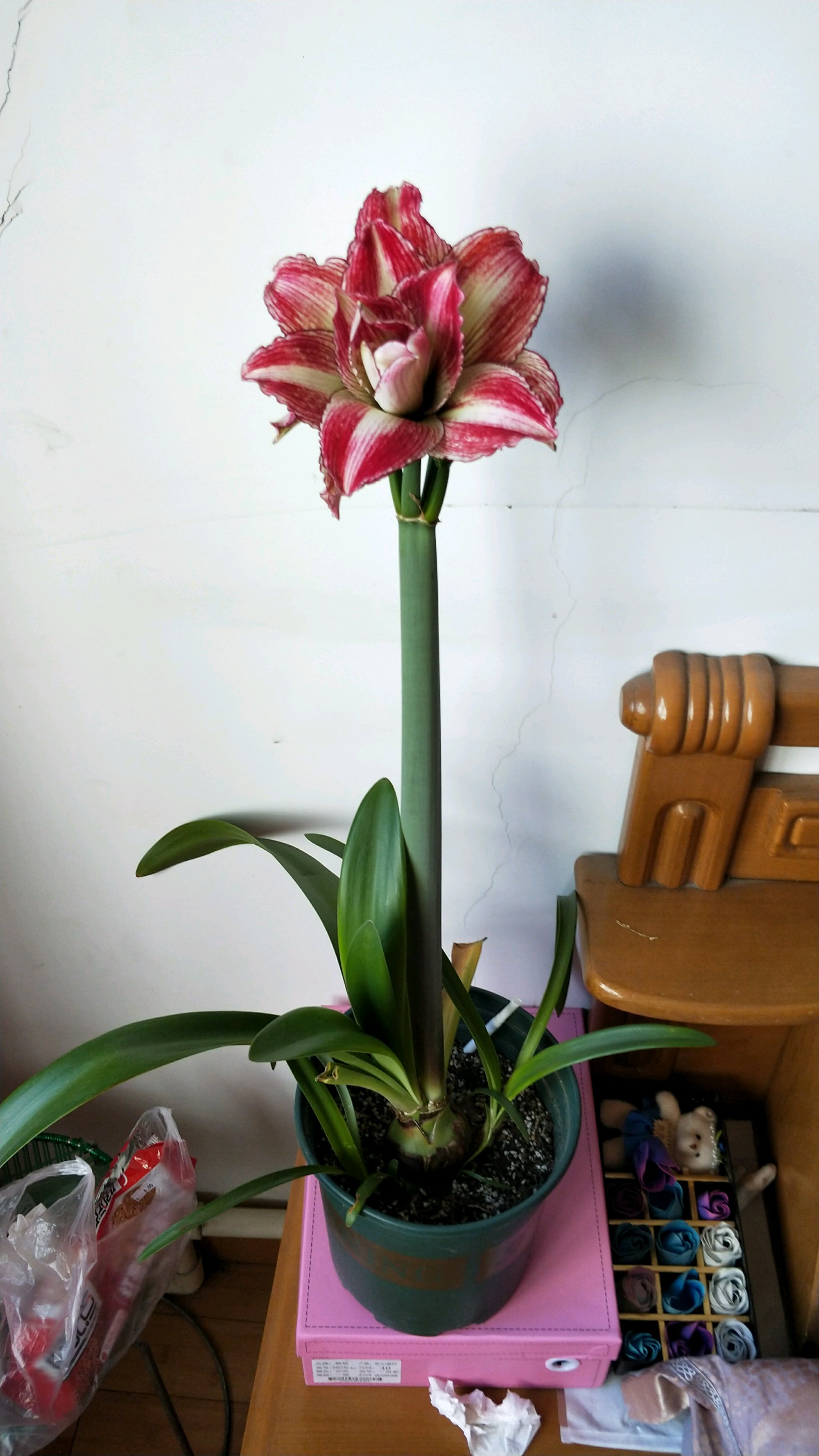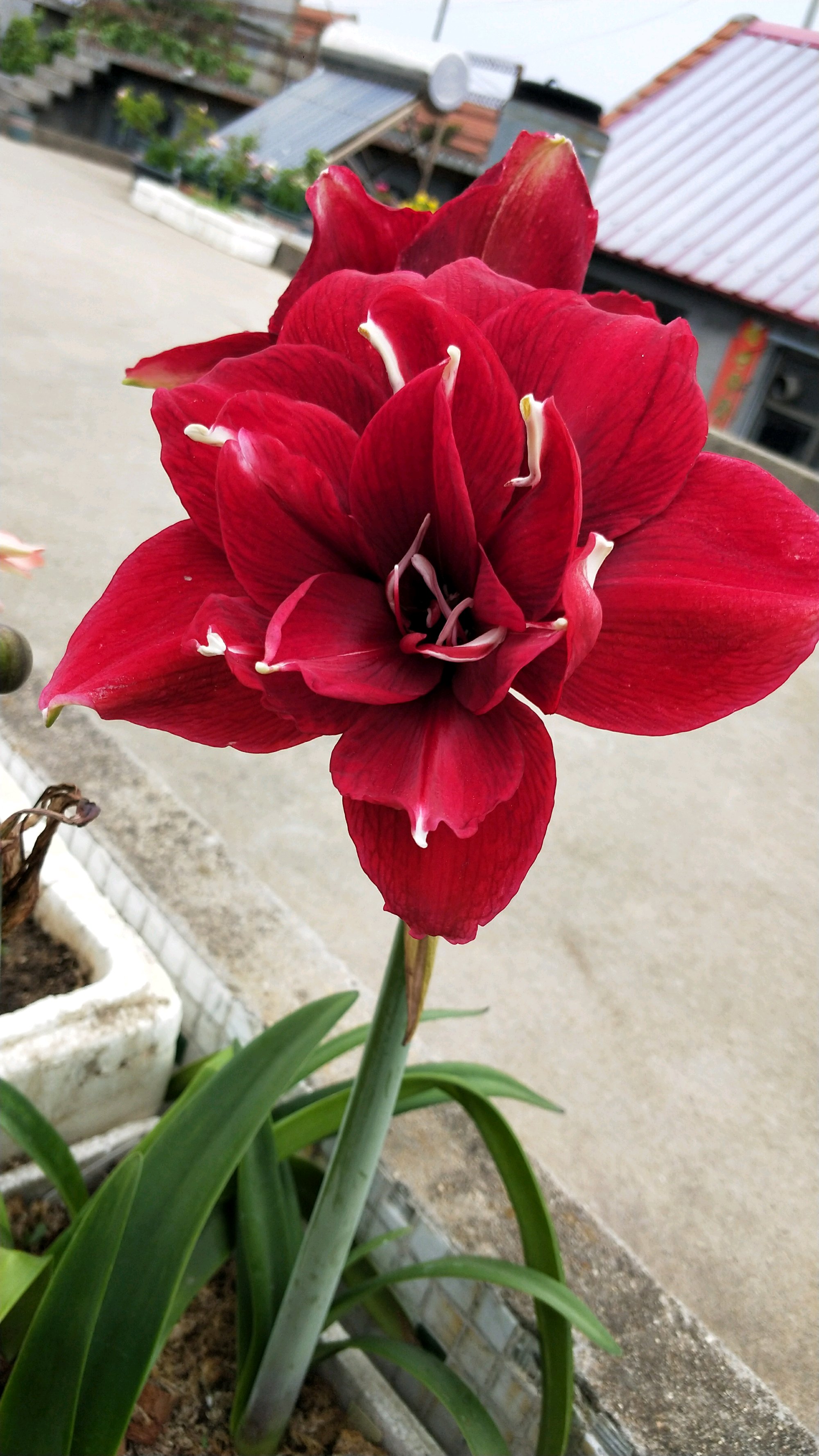 一直喜欢花瓶的条纹。终于开了,可惜我不在家,又淋了一场雨。这颜值