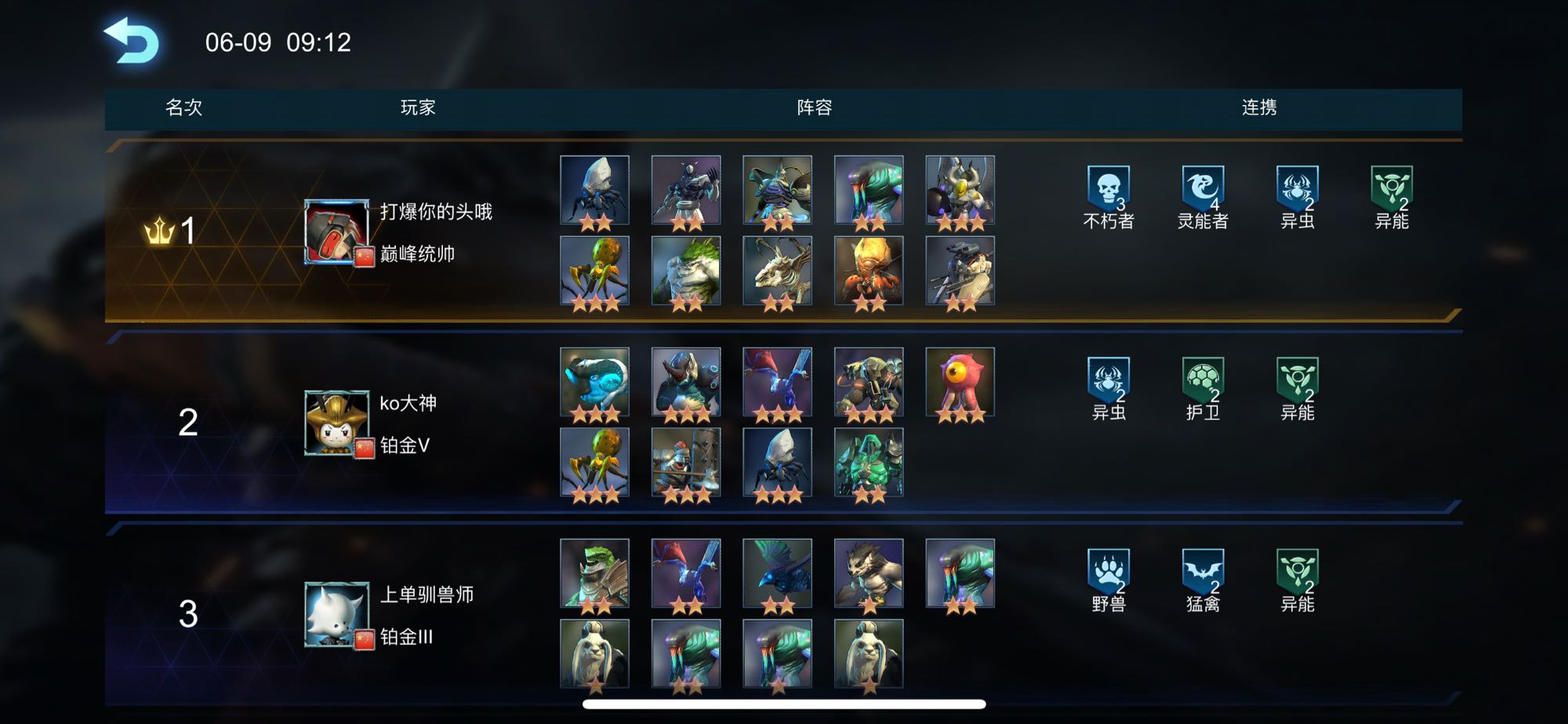 你这阵容质量已经不低了 最难三的雷震子三了 两个五费的两星效果也不比普通的三星差 主要还是对面阵容过于瓜皮 他这阵容buff基本全都差一个 而且你们第三名这鬼阵容怎么打到第三的