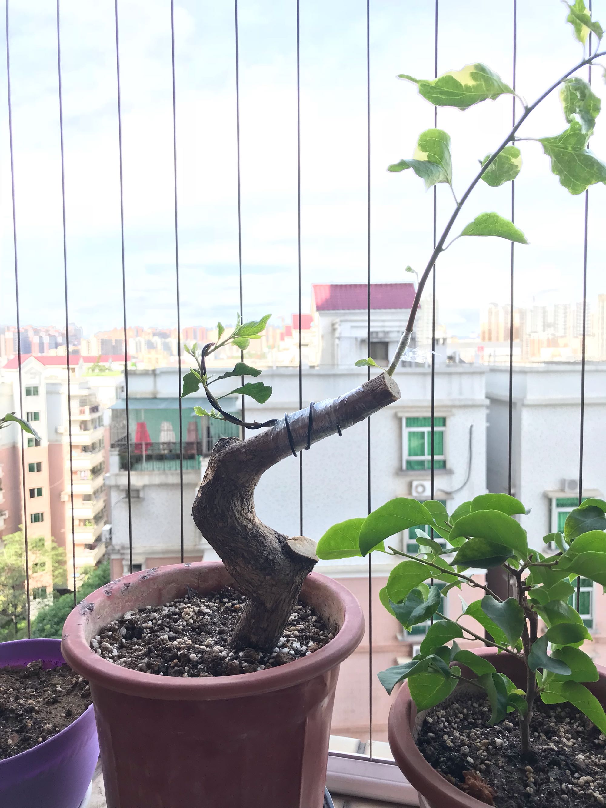 就是反靠接,最初只是这枝太长了想剪掉的,看到旁边光秃秃的一棵还不知道成活没有的生桩,就硬把它拉下反着靠接上去,半个来月吧没反应,就把它剪了,当时把膜拆开发现长稳了,就又把它包上了,没想到过了几天居然冒芽了