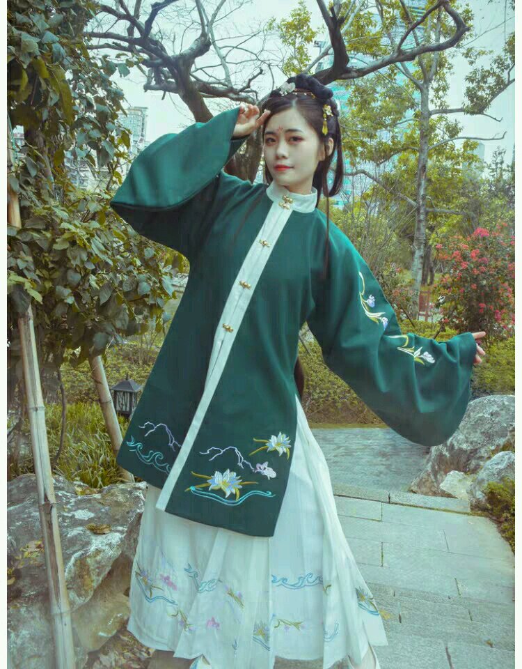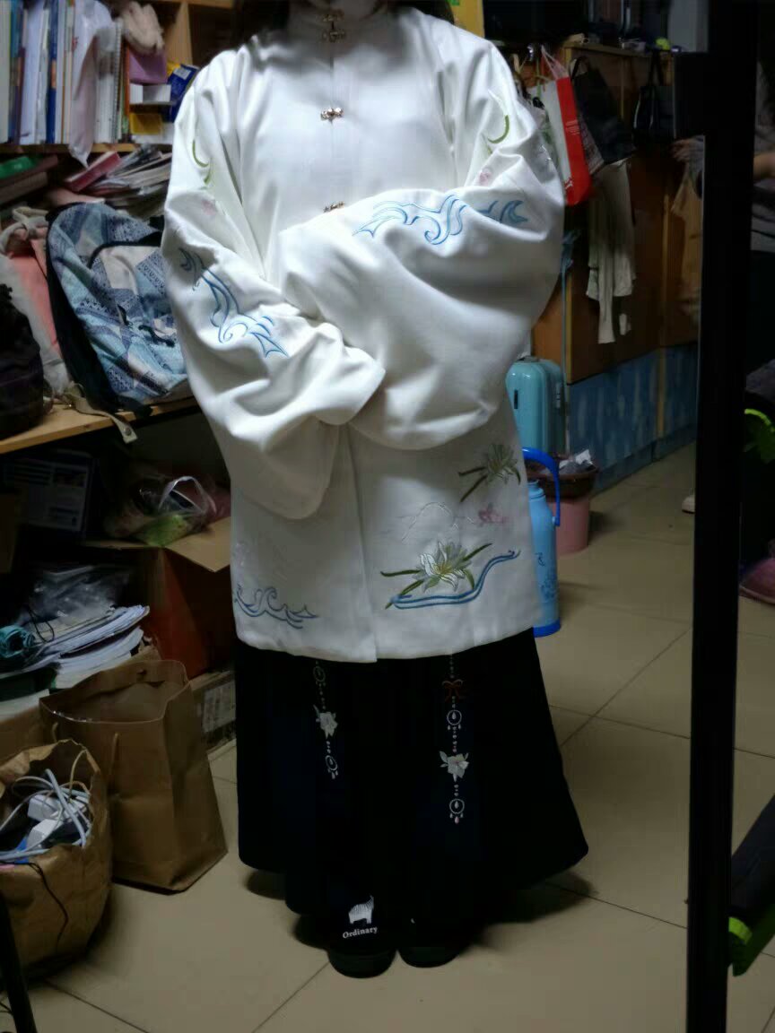 出一件拙一汉服的立领长袄,白色带绣花,材料为呢子的,适合冬季。