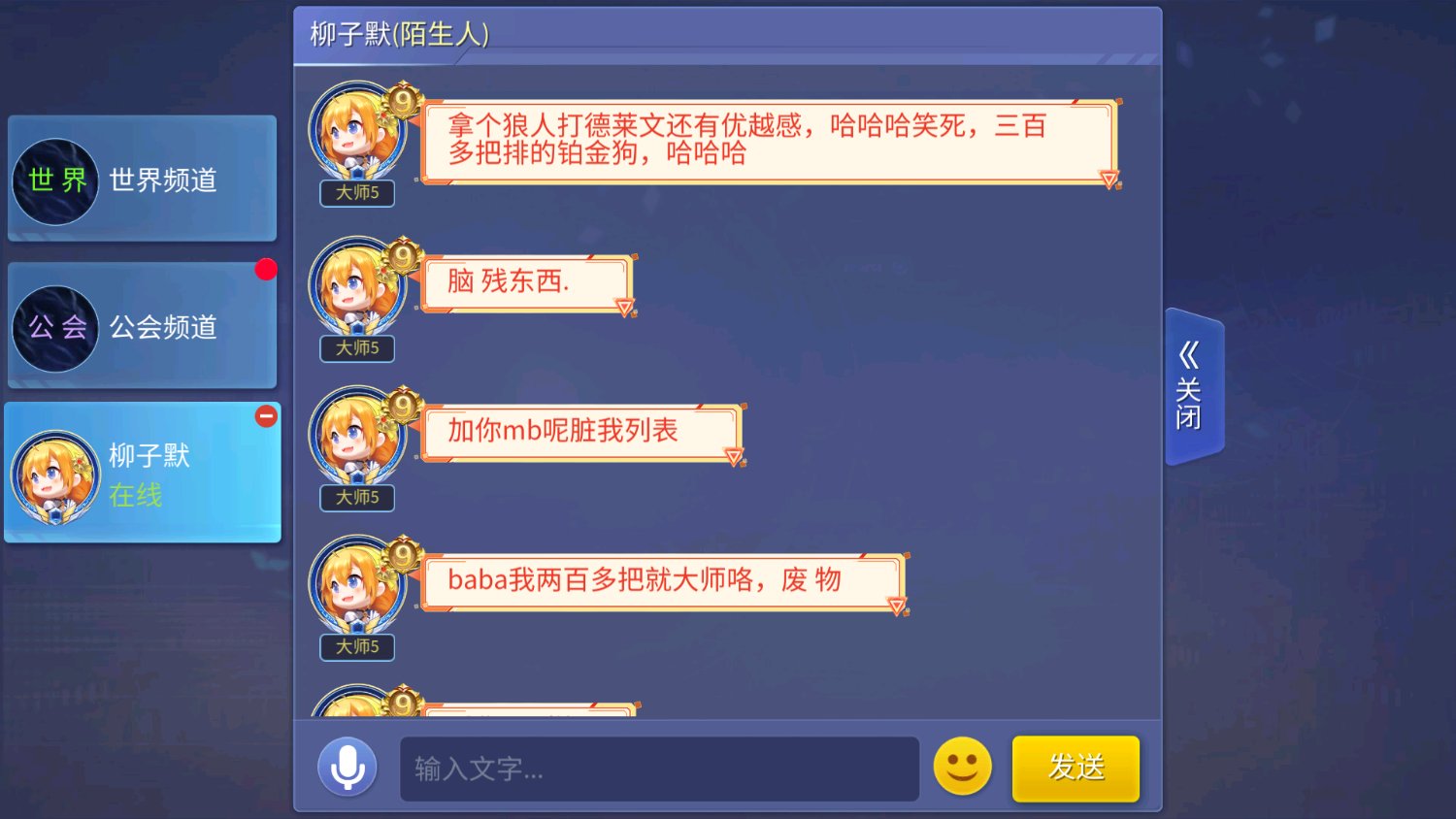 这位大师段位的大神!打个铂金局3-8!还笑****[捂嘴笑][捂嘴笑]!打完了非要找我solo!哎!我一看大师咱也惹不起啊!就想算了吧!结果非要来!我就问他solo什么英雄!大师就是大师!气态非凡啊:随便什么都行!然后我选了狼人!进去一看他德莱文!吓死我了!结果专家级德莱文接斧子都不敢接[捂嘴笑][捂嘴笑][捂嘴笑]打完了又说什么英雄克制啊再来之类的!我铂金侥幸赢一次就不来了吧!然后他就无能狂怒了!他码他钯什么都带出来和我理论了[滑稽][滑稽]