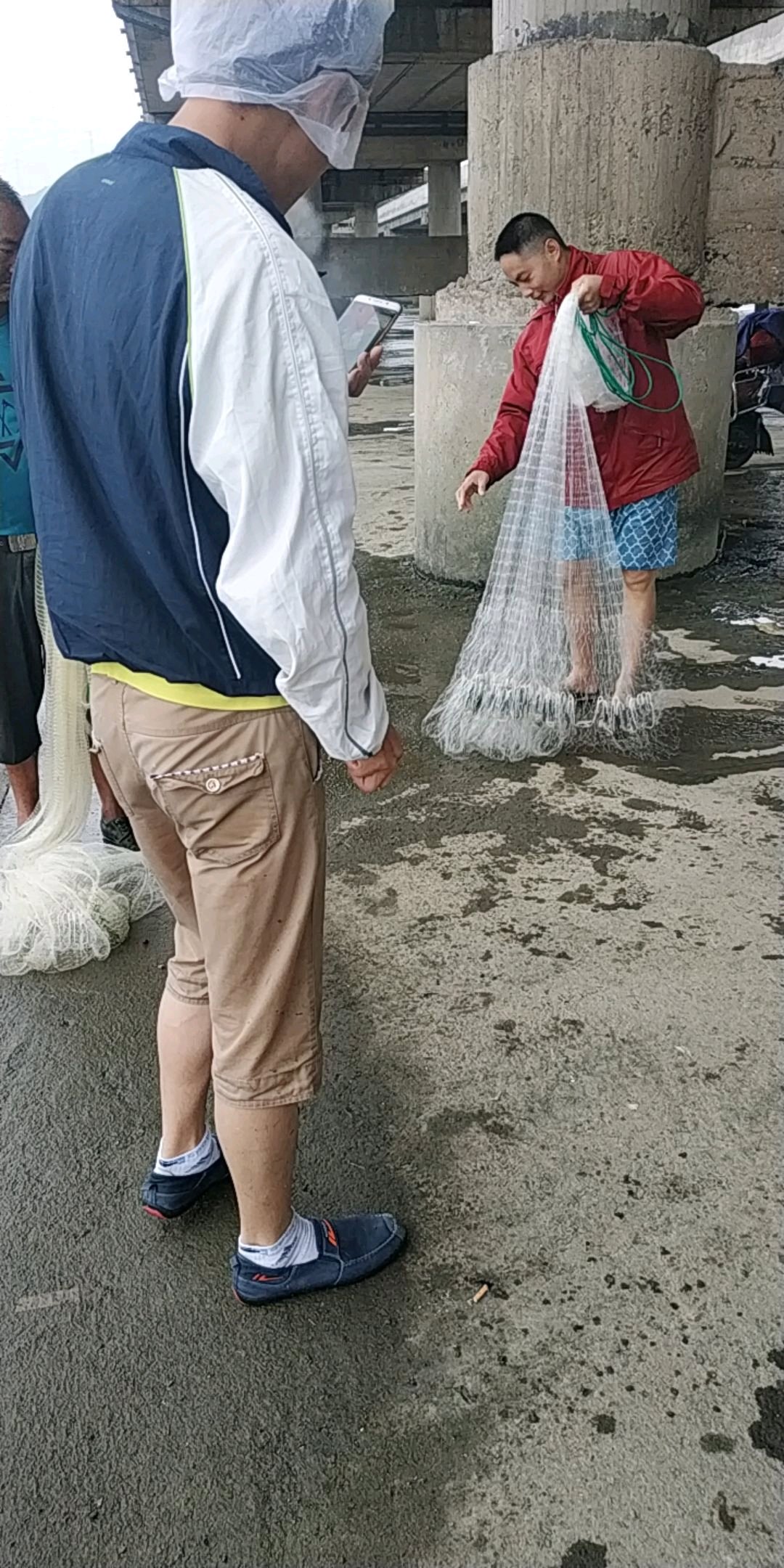 这里涨潮水就上来退水河床全露出来,他们撒网全是受伤的鲈鱼